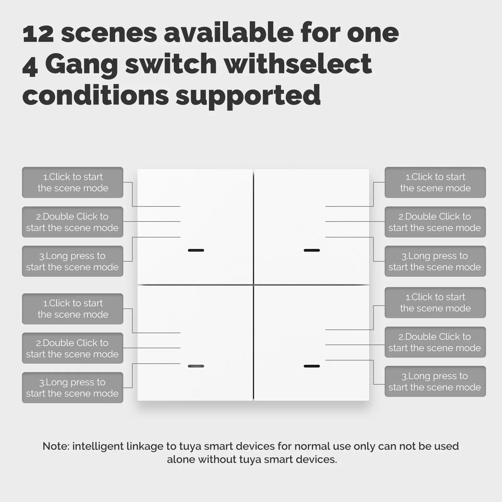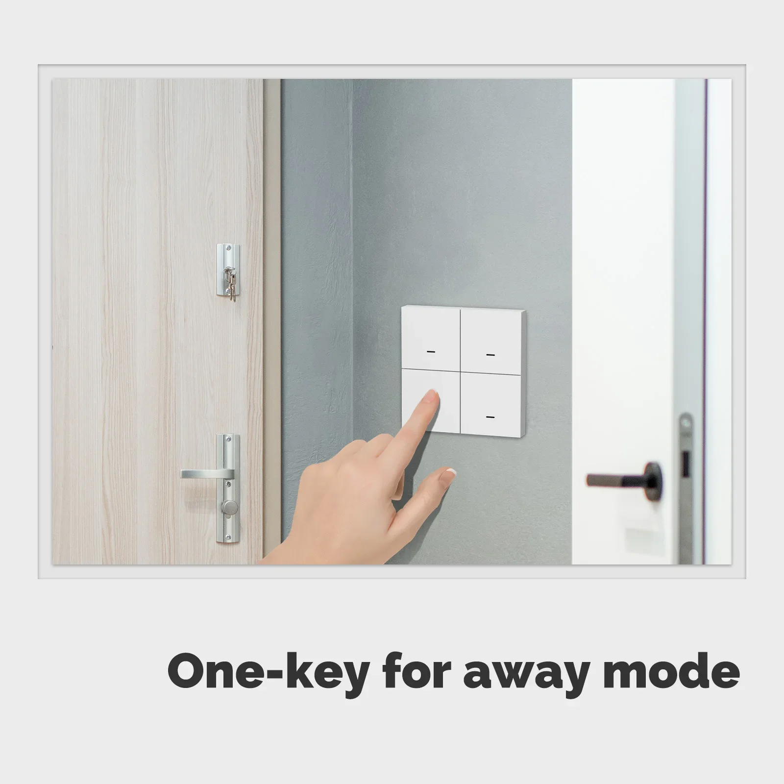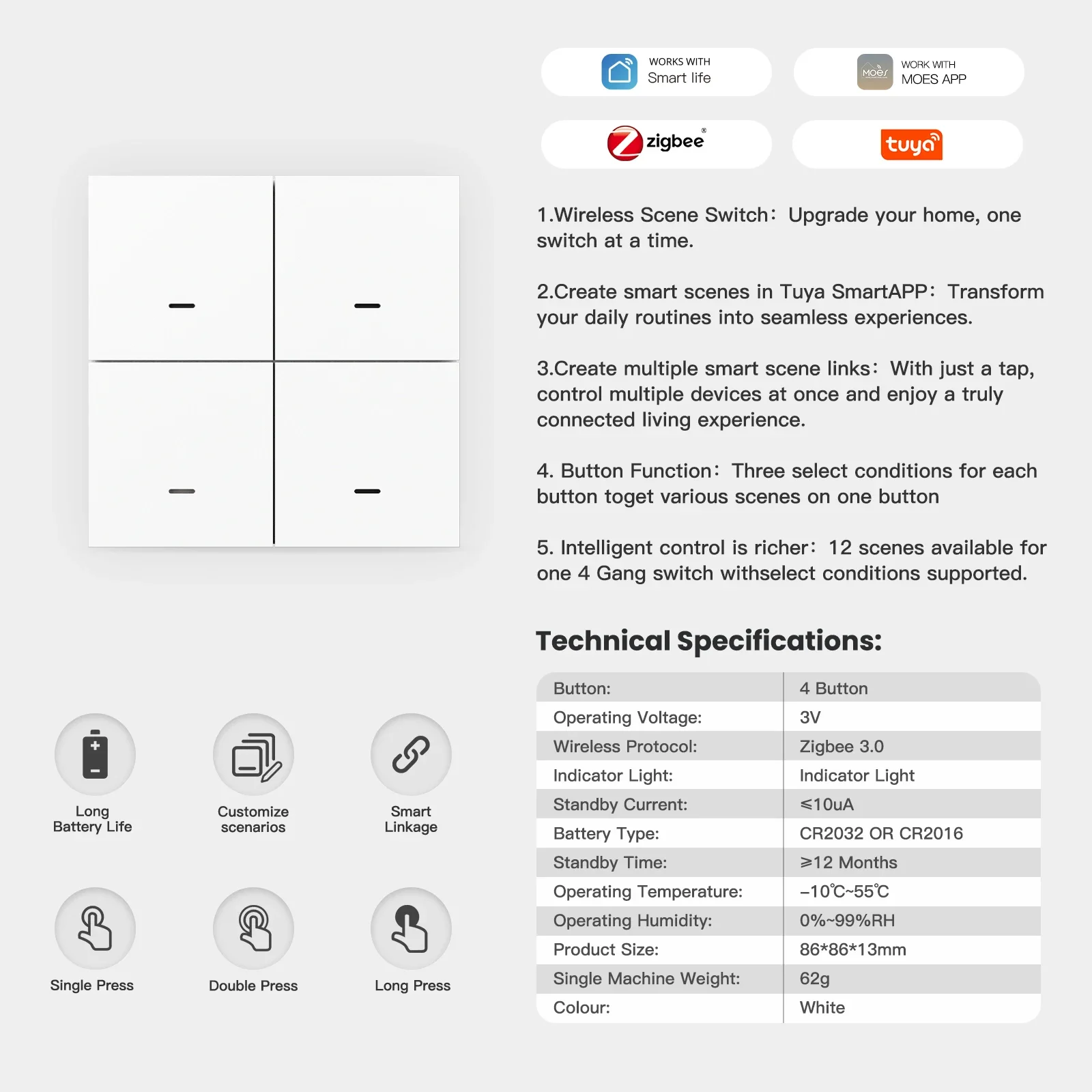 cambio de escena zigbee Interruptor de escena inalámbrico Cree escenas inteligentes en Tuya SmartAPP agregando intelligende Tres condiciones de selección para cada botón para lograr varias escenas en un botón Un toque para el modo hogar 12 escenas disponibles para un interruptor de 4 bandas con las condiciones seleccionadas compatibles Nota: la conexión inteligente a dispositivos inteligentes tuya solo para uso normal no se puede usar sola sin dispositivos inteligentes tuya. Aviso antes de la compra NOTA: Se requiere una puerta de enlace ZigBee, compre además. Agrégalo como quieras El interruptor con adhesivo de doble cara se puede fijar fácilmente al dormitorio, salón, cocina, comedor y otros lugares. Control remoto inalámbrico con tu hogar inteligente Cree varios tipos de vinculación de escenas inteligentes con cualquier dispositivo inteligente tuya que desee. Toque para ejecutar el modo de suspensión Mantenga presionado el interruptor de escena para apagar todas sus luces antes de dormir. Crea múltiples escenarios inteligentes desde tu teléfono móvil Imagina el enlace inteligente para crear un espacio de entrada con el interruptor de escena inalámbrico en tus teléfonos inteligentes Una tecla para el modo alejado Presione dos veces el interruptor de escena para apagar todas sus luces, aires acondicionados, ventiladores y otros dispositivos electrónicos antes de salir al trabajo. Modo de despertador Mueva su dedo al interruptor de escena de la pared para iniciar su día con un estado de ánimo agradable Especificación