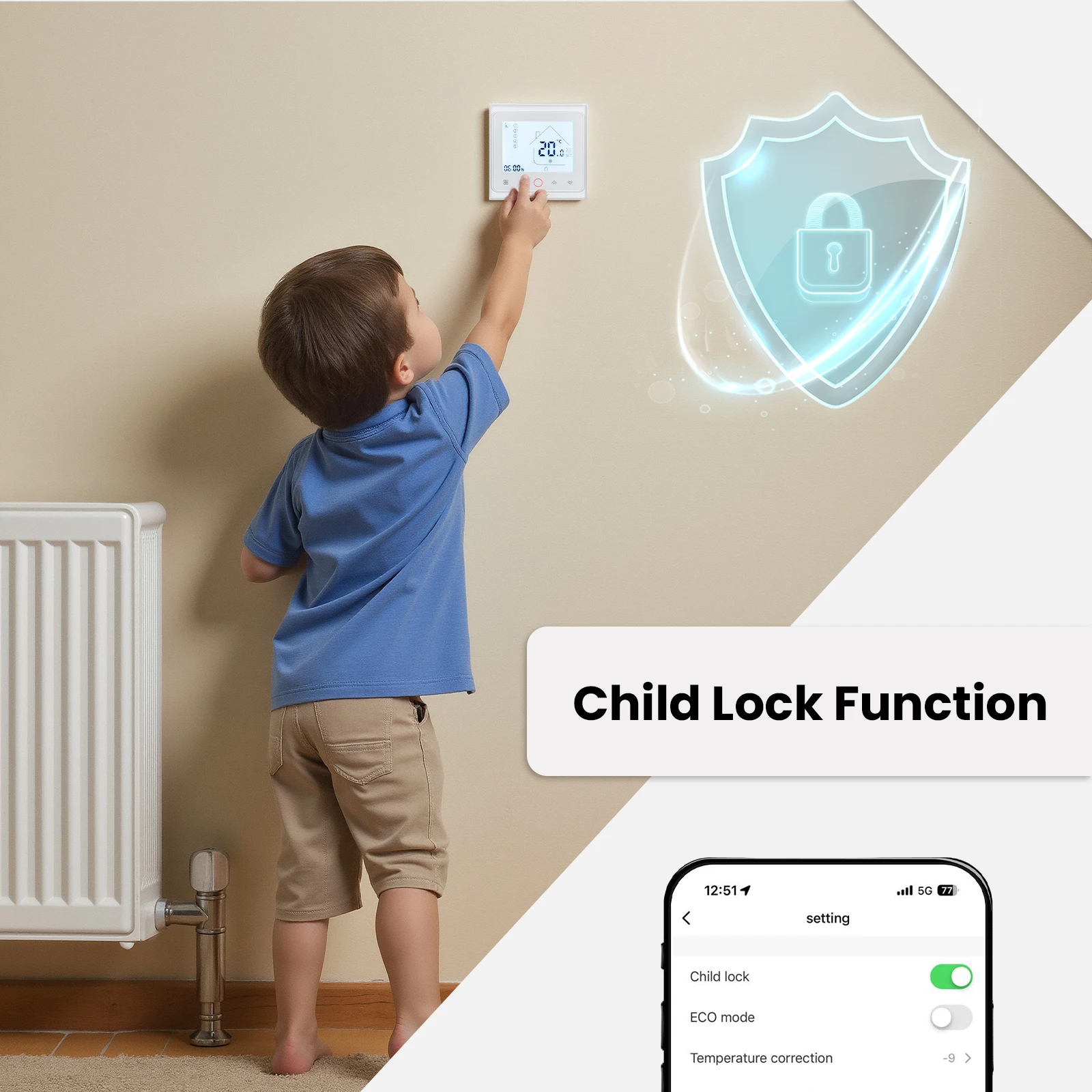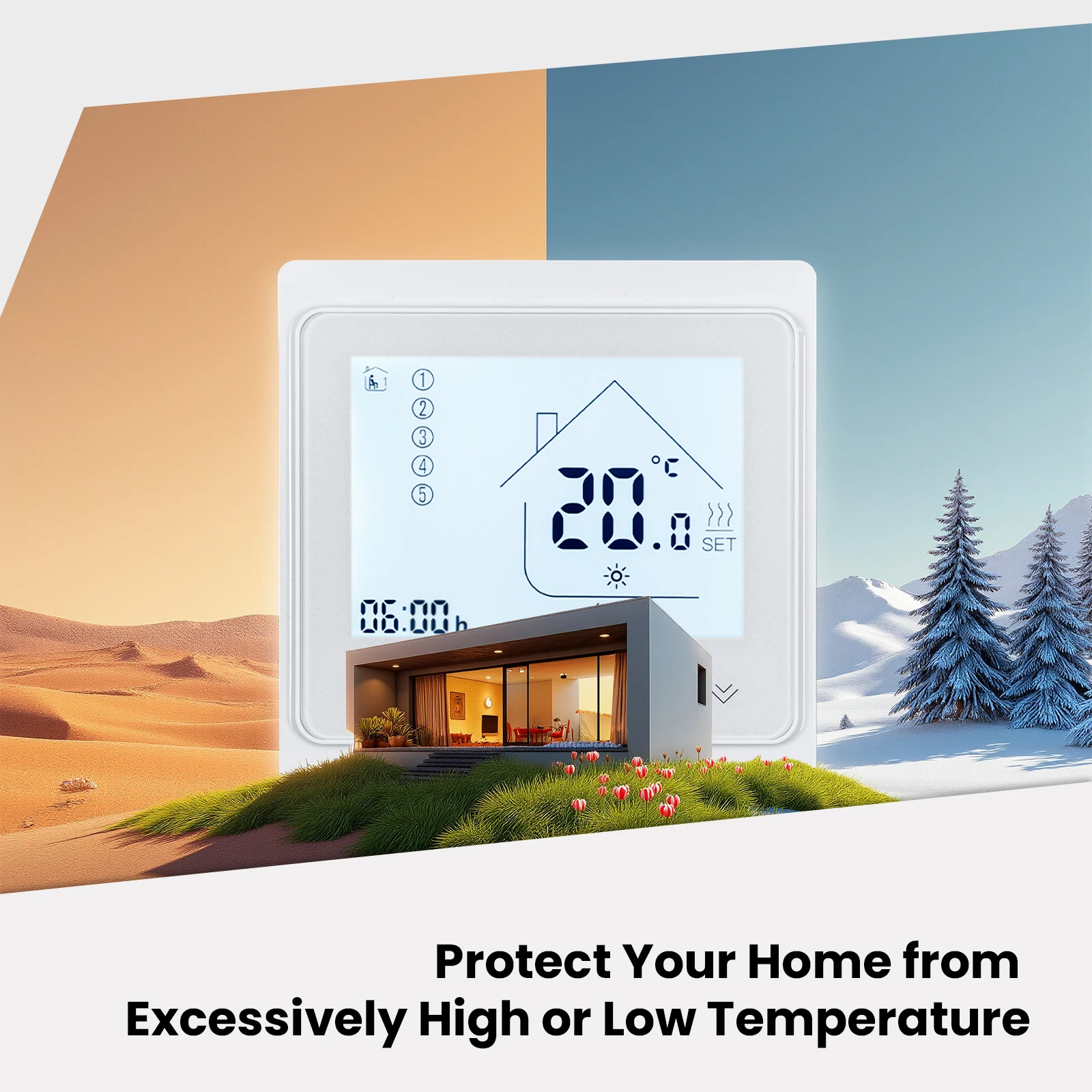 Después de activar la función de protección contra altas temperaturas, cuando la temperatura alcanza el pico establecido, el termostato se cerrará automáticamente para proteger la seguridad del sistema de control de temperatura y de la familia;Cuando se activa la función de protección contra baja temperatura, el termostato se encenderá automáticamente cuando la temperatura sea demasiado baja para garantizar que su hogar se mantenga a una temperatura adecuada y segura.