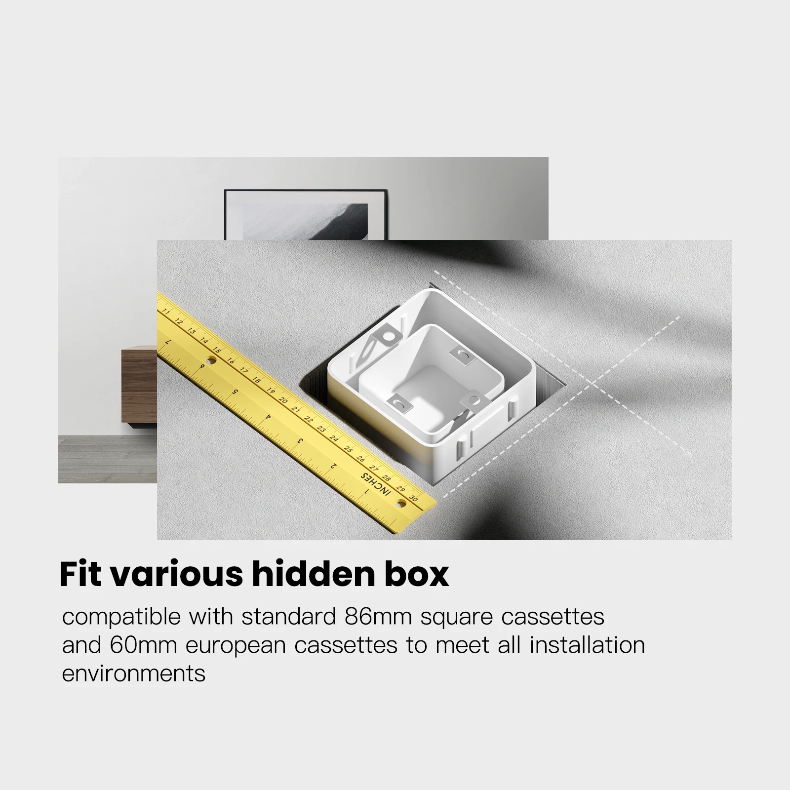 El tamaño compacto facilita su instalación en diferentes tamaños de cajas ocultas, como casetes cuadrados de 86 mm y casetes redondos europeos de 60 mm.