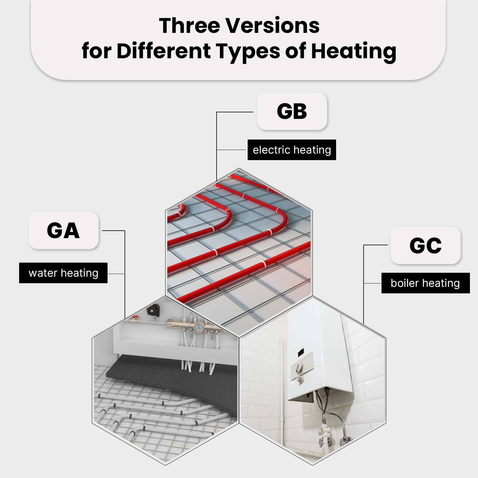 Los tres productos están diseñados para diferentes métodos de calentamiento: calentamiento de agua, calefacción eléctrica y caldera.Elija el termostato GA, GB o GC correspondiente según el método de calefacción de su hogar.
