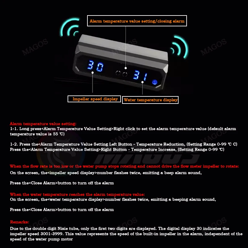 Debido al tubo Nixie de dos dígitos, solo se muestran los dos primeros dígitos. La pantalla digital 30 indica la velocidad del impulsor 3001-3999. Este valor representa la velocidad del impulsor incorporado en la alarma, independiente de la velocidad del motor de la bomba de agua.