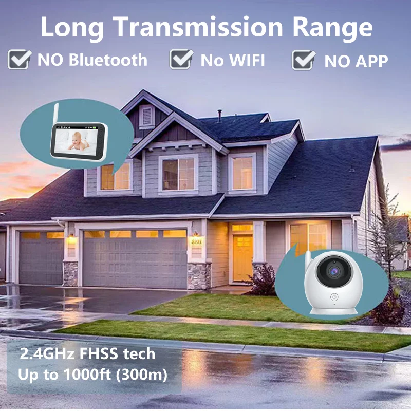 Simplemente conecte la cámara y el monitor para usarlo, no se requiere una conexión WiFi complicada ni ninguna otra descarga de aplicaciones. Viene con tecnología inalámbrica de 2,4 GHz que permite a los padres disfrutar de una transmisión en vivo clara y estable de su hijo desde cualquier lugar de la casa con una cobertura de hasta 1000 pies (cuando hay línea de visión, sin obstrucción).
