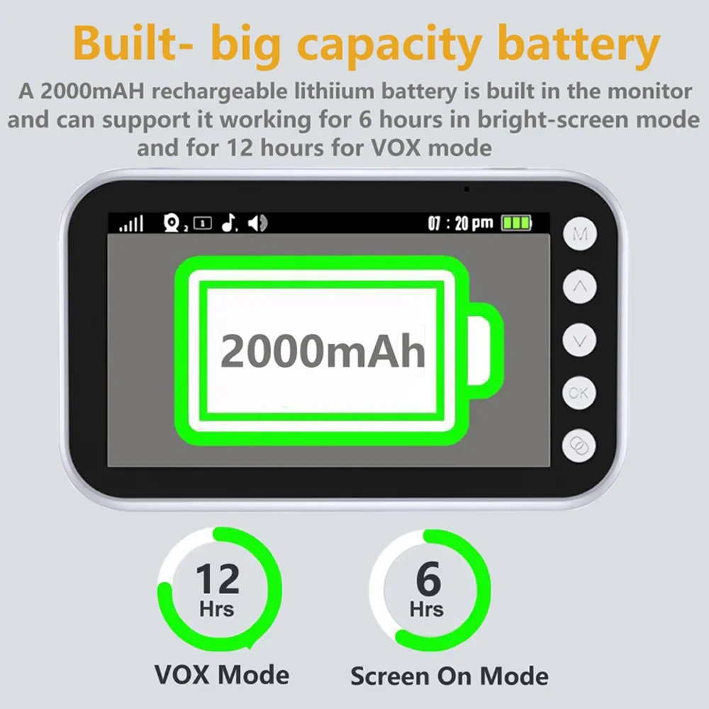 El monitor para padres es inalámbrico y está equipado con una batería incorporada de 2000mAh, puede llevar el monitor a cualquier lugar de su casa y monitorear la habitación de su bebé sin importar si está cocinando, leyendo, o haciendo yoga.