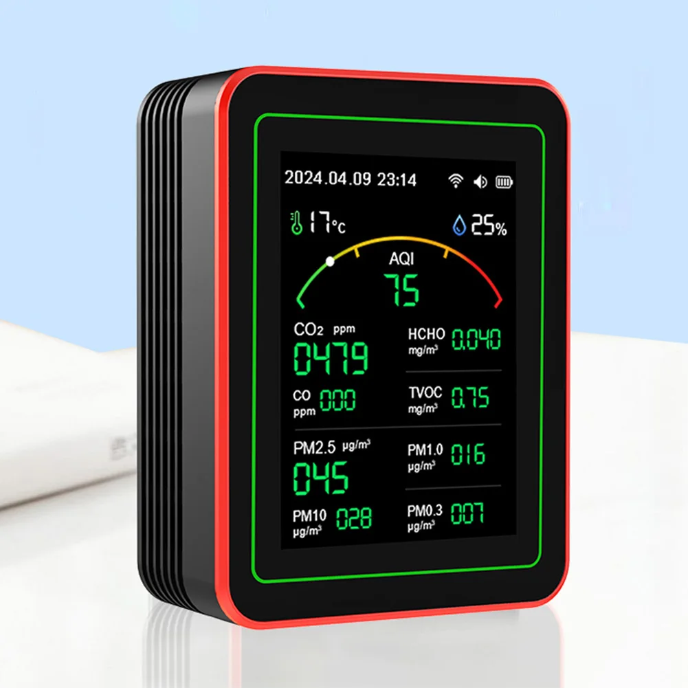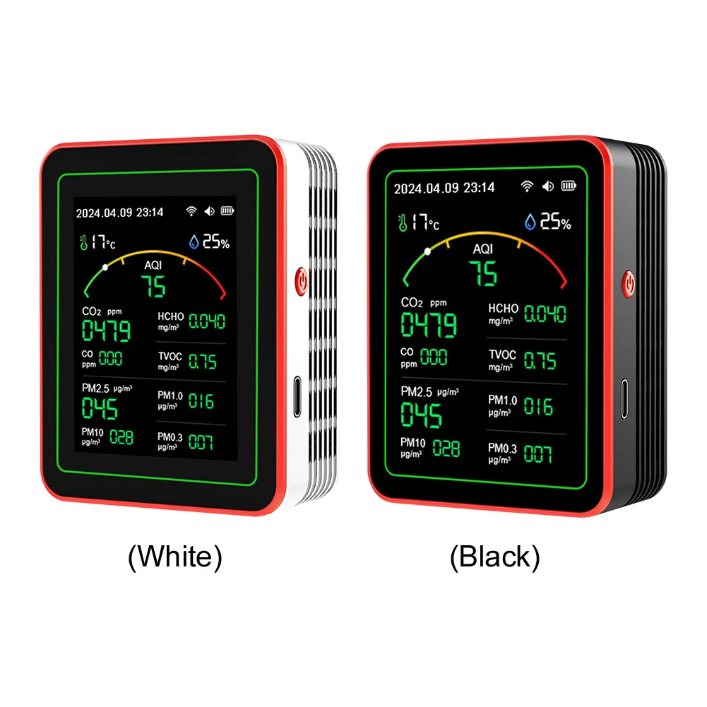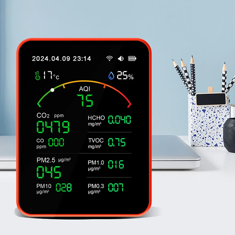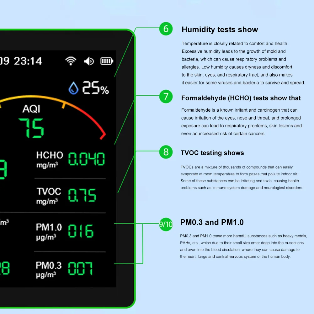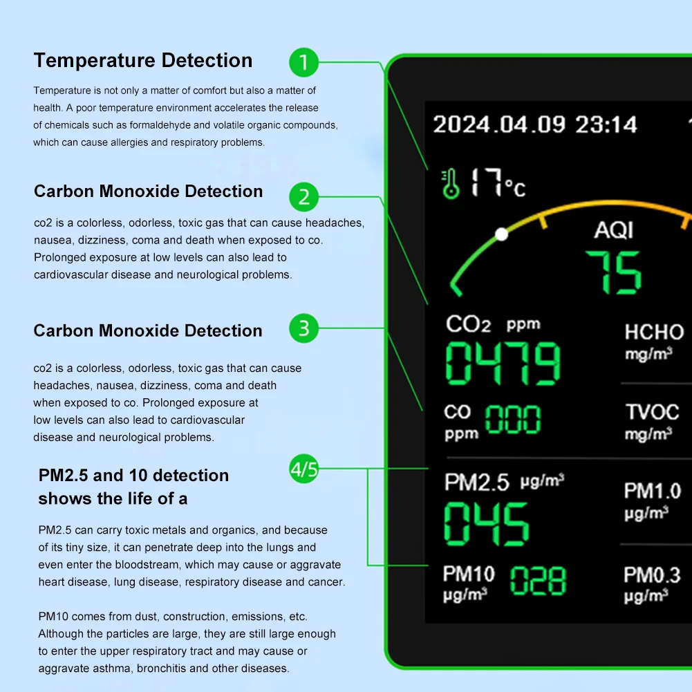 1.Detección integral de la calidad del aire:Este detector de calidad del aire es un dispositivo 15 en 1 que mide AQI, CO, CO2, PM0.3, PM1.0, PM2.5, PM10, formaldehído (HCHO), TVOC, temperatura y humedad.También cuenta con visualización de la hora, alarmas, temporizadores y funciones de cuenta regresiva, lo que brinda una solución completa para sus necesidades de calidad del aire.