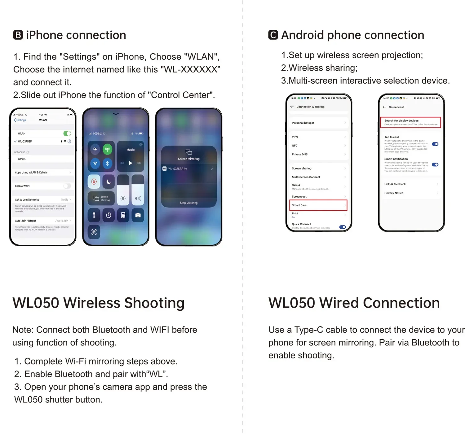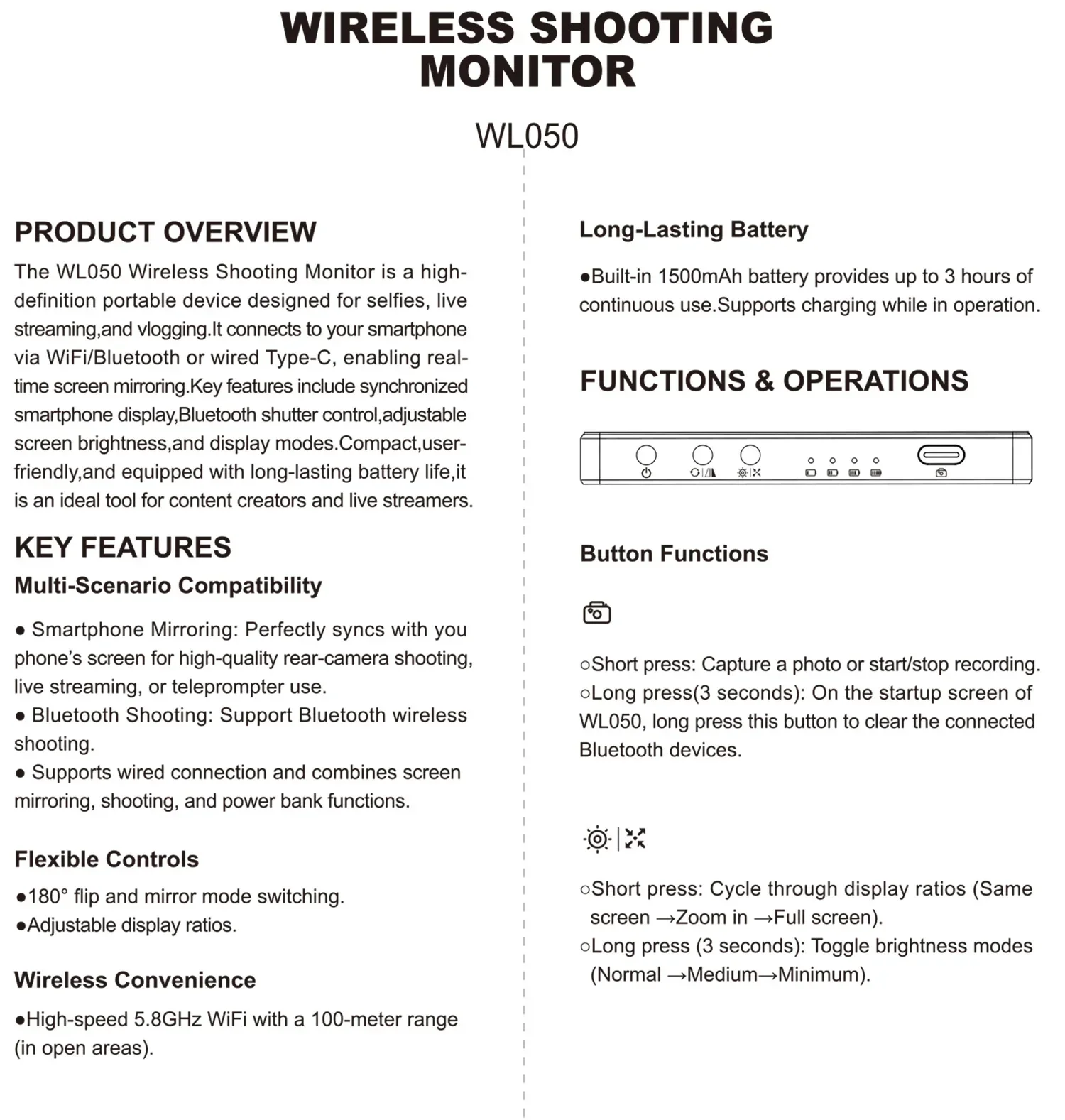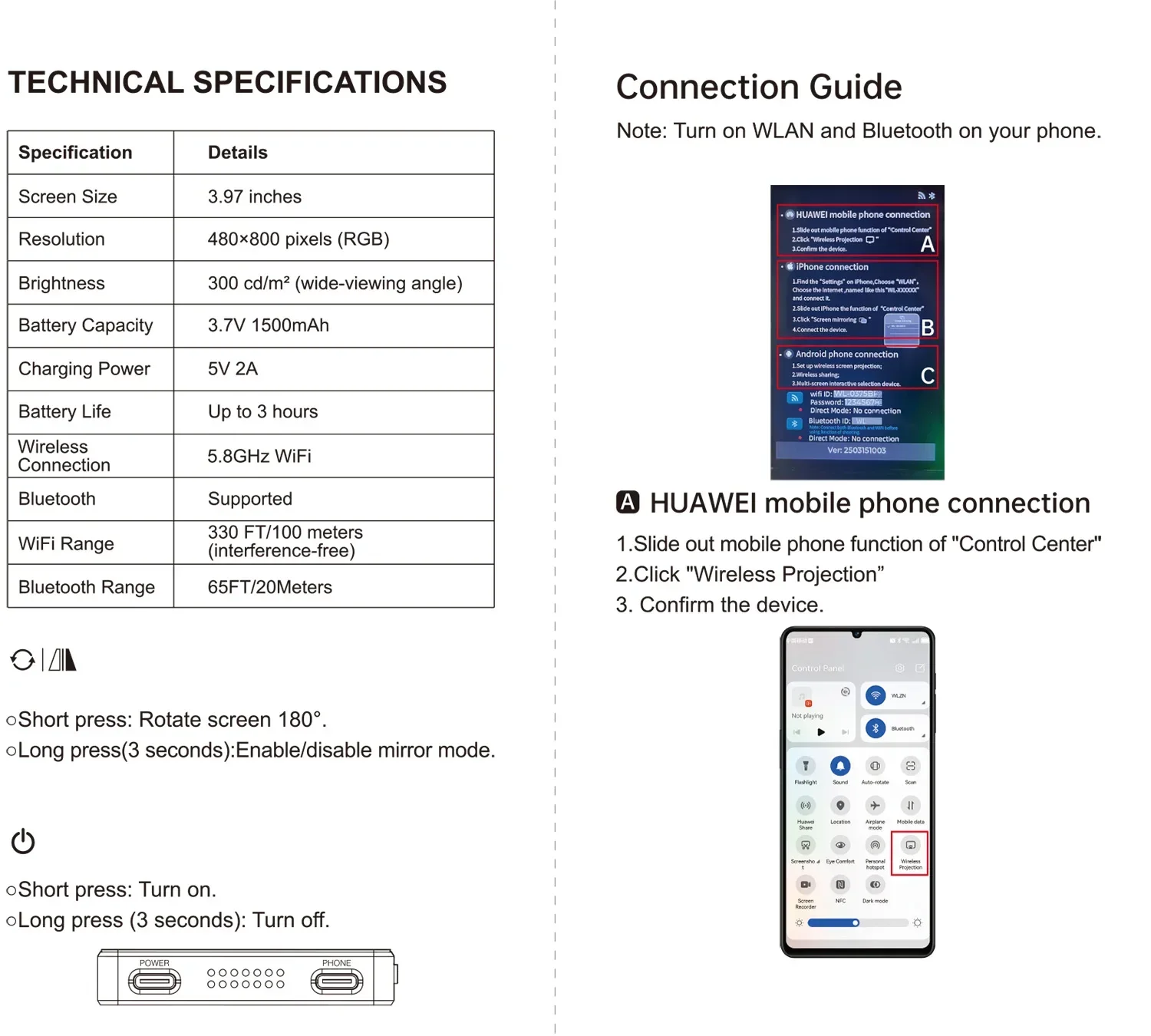 1.Soporte teléfonos iphone yteléfono Android parcial Los teléfonos Android necesitan la función de compartir inalámbrico de pantalla y luego pueden usar este producto. (como gafas pixel, vivoX100, etc.que entonces no tiene función de compartir inalámbrico no se puede utilizar este producto) 2.Por favor tenga en cuenta que Este es un monitor, no un reproductor, por lo que no hay salida de audio.,cuando está conectado al teléfono, Su teléfono no tendrá salida de audio. 3. Tamaño portátil pequeño