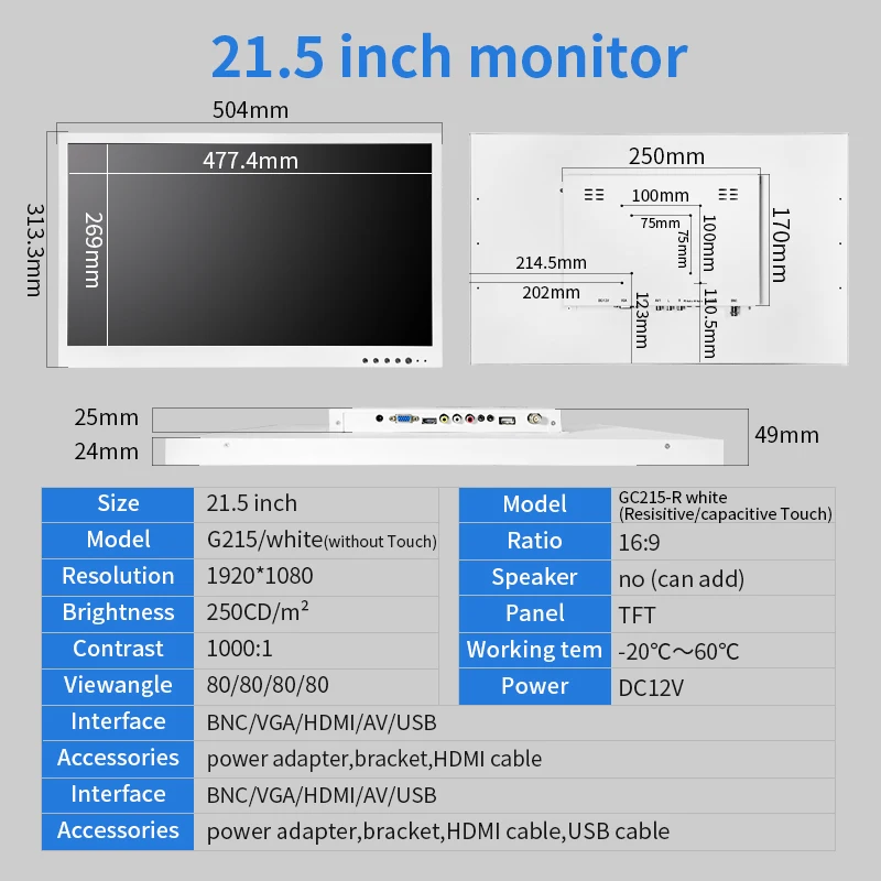 Las especificaciones del monitor industrial 16:9 de 21,5 pulgadas