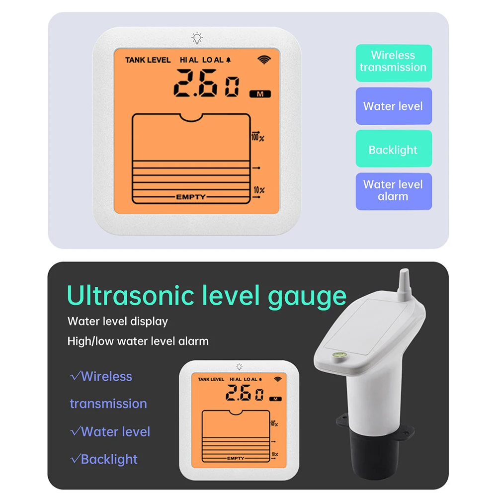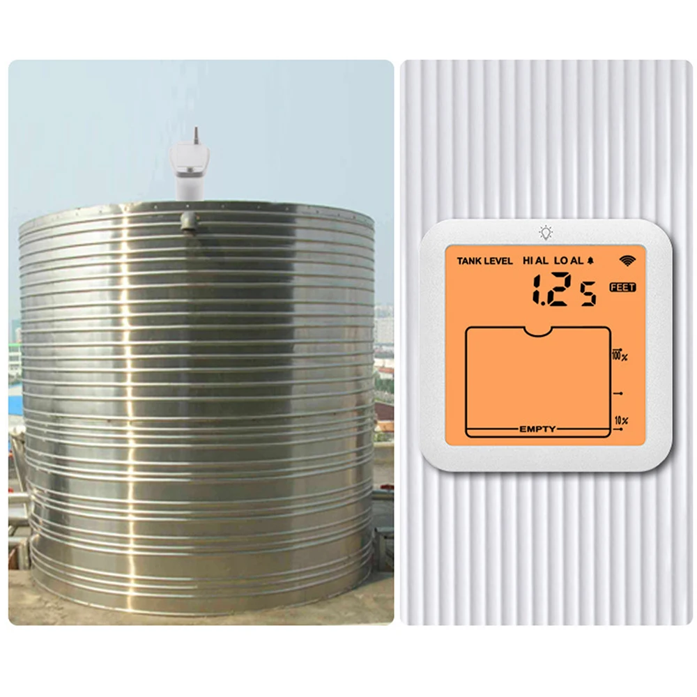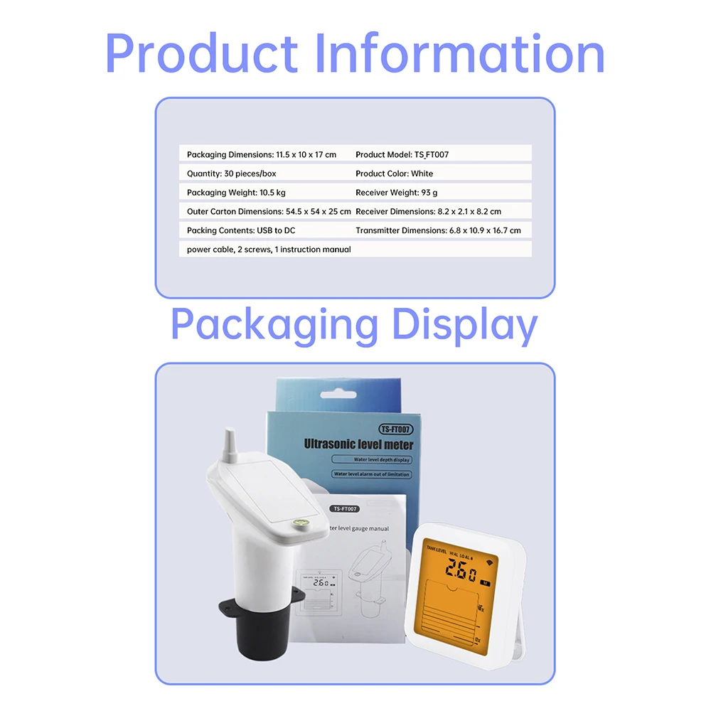 Alarm duration: 120 seconds Simulated display of water level depth on a 10 element LCD bar chart Water level measurement range: 1~5m Transmitter protection level: IP65 (effectively protects against rainwater splashes from any direction) Wireless transmission distance: open distance is 100 meters, effective distance is 30 meters Screen size: 3.42 inches High and low temperature testing: -20~60 ℃ Water tank level display unit: meter/foot (default upon startup: meter) Power supply method (shipment does not include batteries): Receiver: Powered by 2 * AAA batteries/USB to DC power cord Transmitter: Powered by 6 * AAA batteries