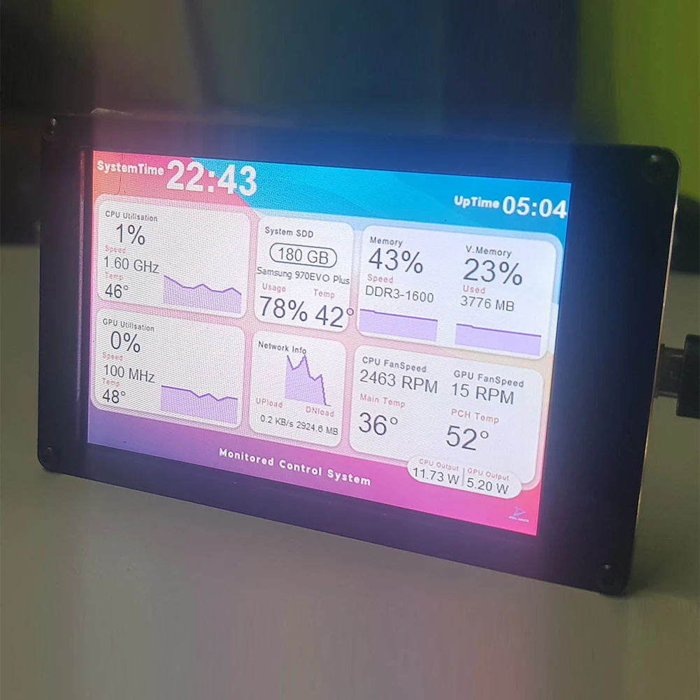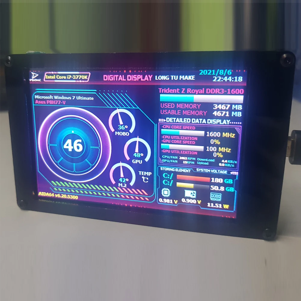 4. Seguimiento múltiple:Esta pantalla mostrará los datos de CPU, GPU, RAM, HDD, hora y fecha. Operación de un botón, edición de tema visual, cambio de fondo de un botón, cambio de tema de un botón, solo una línea de datos, sin fuente de alimentación adicional. El Software se iniciará automáticamente cuando se encienda el ordenador y el uso posterior de la pantalla se ejecutará automáticamente sin ocupar los recursos de la tarjeta gráfica.
