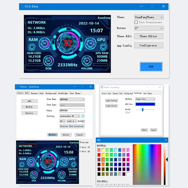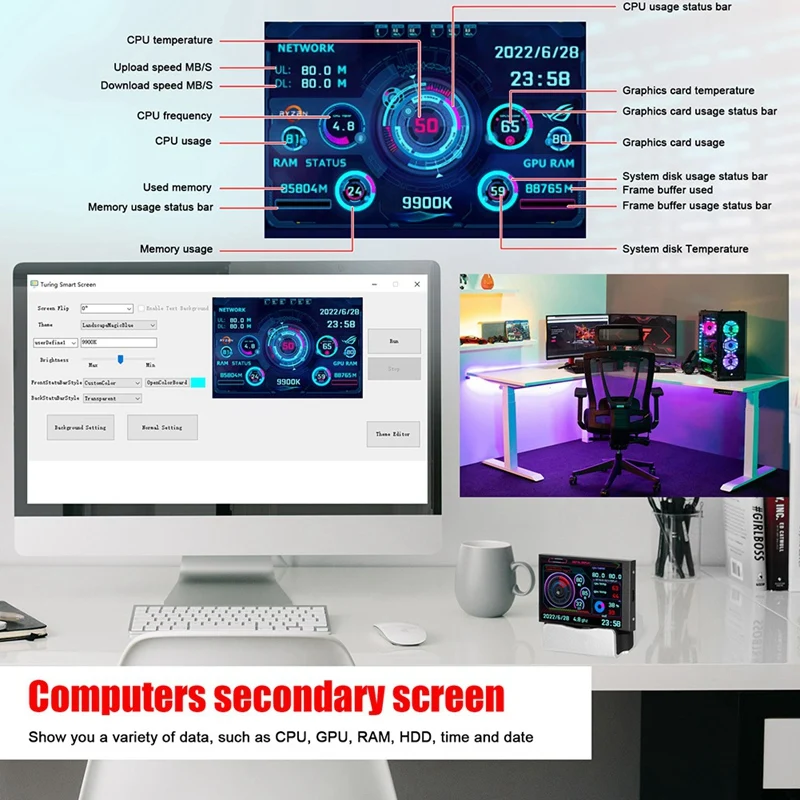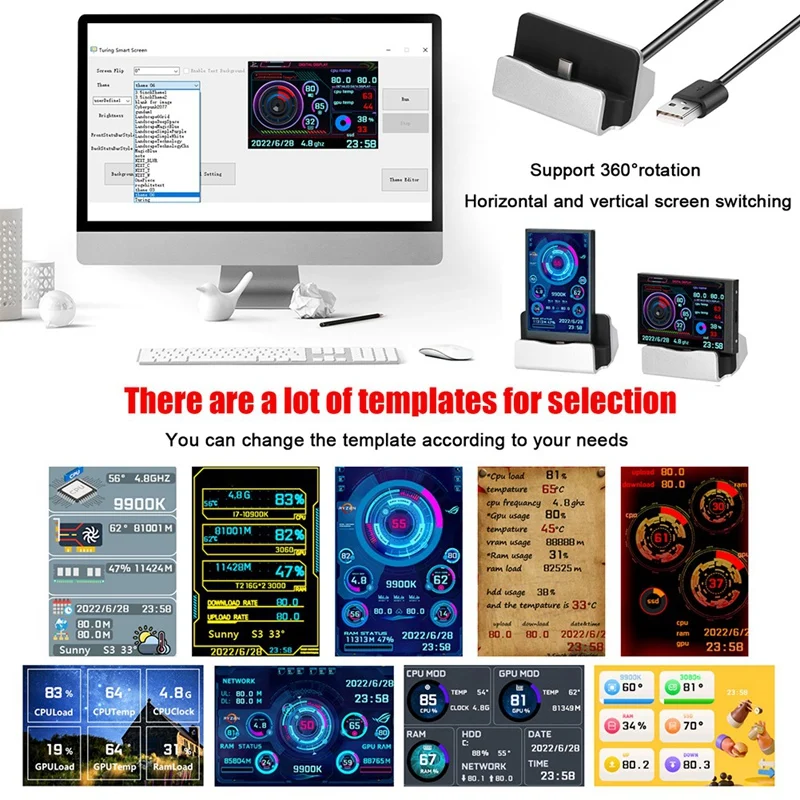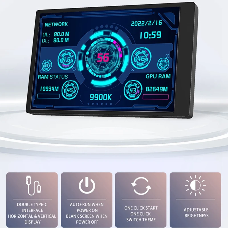 Operación de una tecla, edición de tema visual, Fondo de cambio de una tecla, tema de cambio de una tecla, solo se necesita un cable de datos sin fuente de alimentación adicional, se inicia automáticamente después del arranque, y la pantalla de uso posterior ejecutará automáticamente el software sin ocupar los recursos de la tarjeta gráfica.