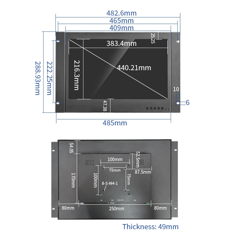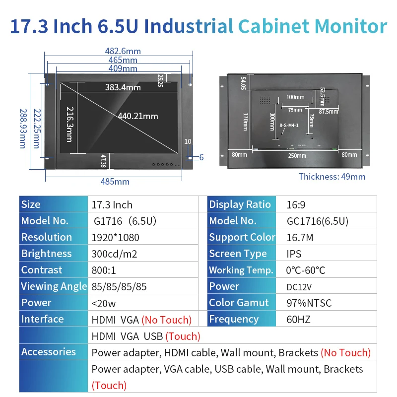Monitor de gabinete industrial de 17,3 pulgadas 6.5U