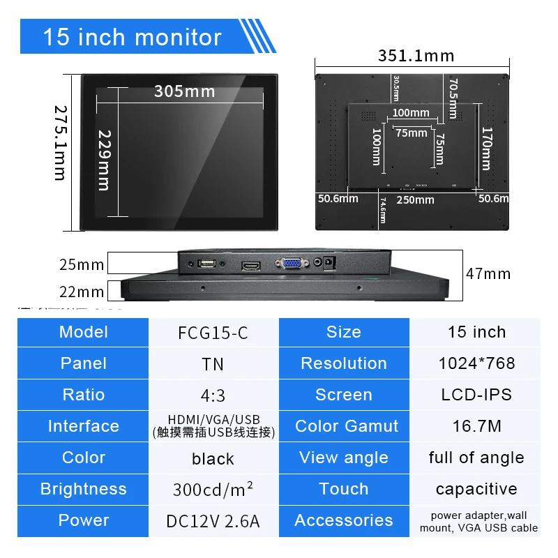 Comprar Monitor de pantalla táctil capacitiva LCD resistente al agua de 15 pulgadas 1024*768 con interfaz USB HDMI VGA para uso Industrial