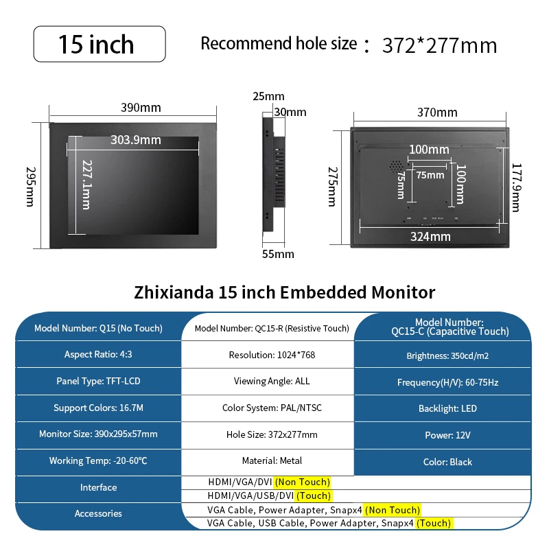 ZHIXIANDA 15 Inch Industrial Metal Frame Wall Embedded Mount Lcd Display HDMI Port General Resistive Touch Screen Monitor