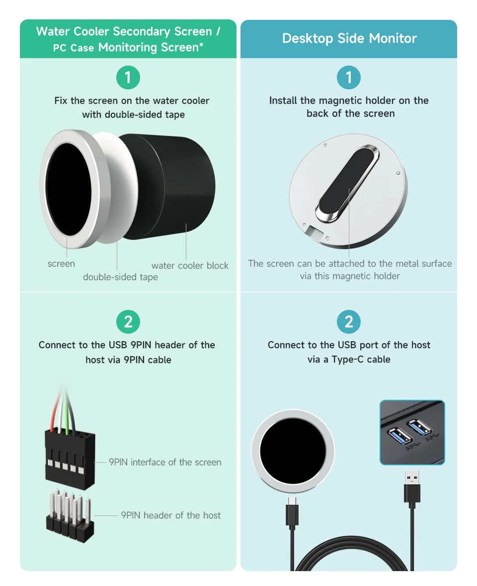 * Se recomienda utilizar la versión de 2,1/2,8 pulgadas como pantalla de enfriador de agua, y es necesario considerar la carcasa real de la PC dentro del espacio cuando se usa una versión de 3,4/4 pulgadas con un tamaño más grande.