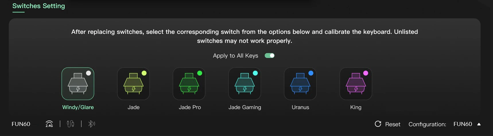 La serie FUN60 (excepto la versión básica FUN60) ofrece compatibilidad cruzada con 5 interruptores magnéticos de terceros.Los usuarios pueden seleccionar el interruptor correspondiente de la lista del controlador MonsGeek y calibrar fácilmente el teclado después del reemplazo.También puedes mezclarlos y combinarlos en diferentes teclas simultáneamente.