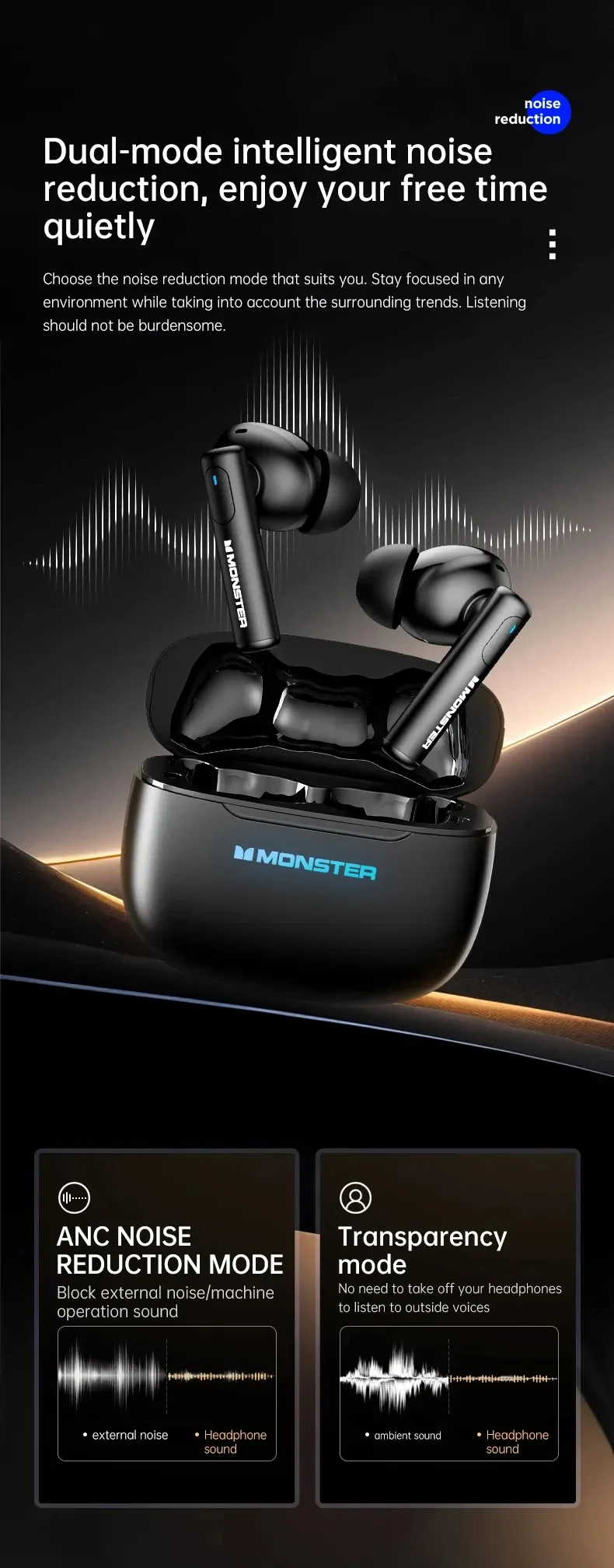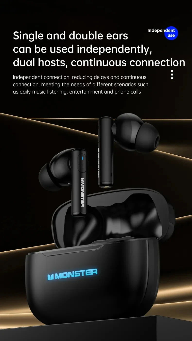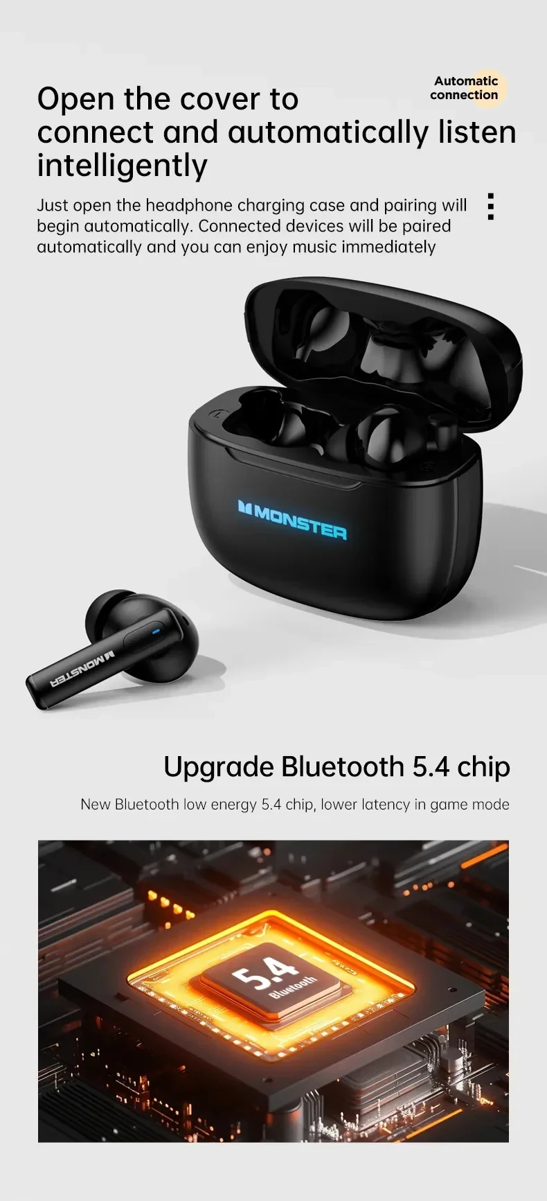 1. Diseño tecnológico: se iluminará el logotipo de monstruo en los auriculares.Experimente un audio estable y de baja latencia con Bluetooth 5.4, perfecto para juegos y transmisión.