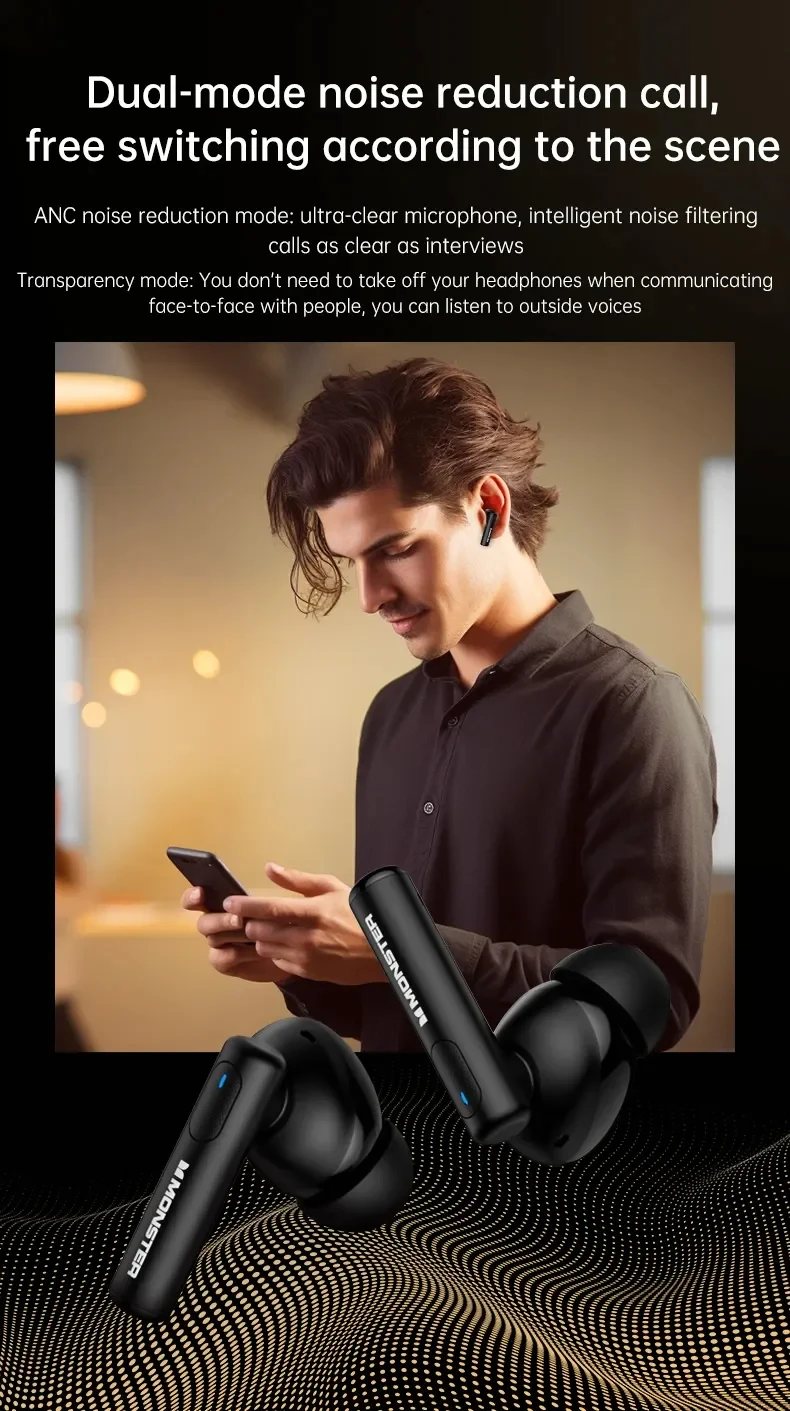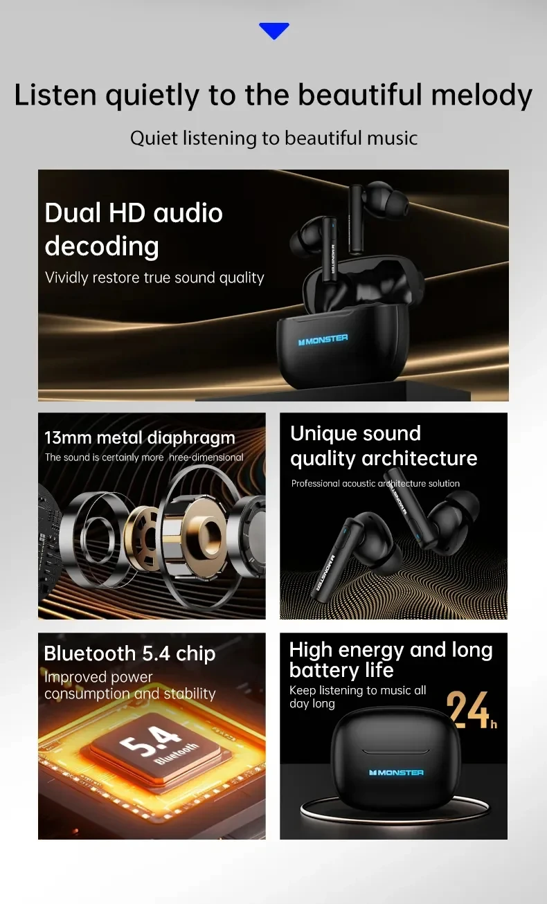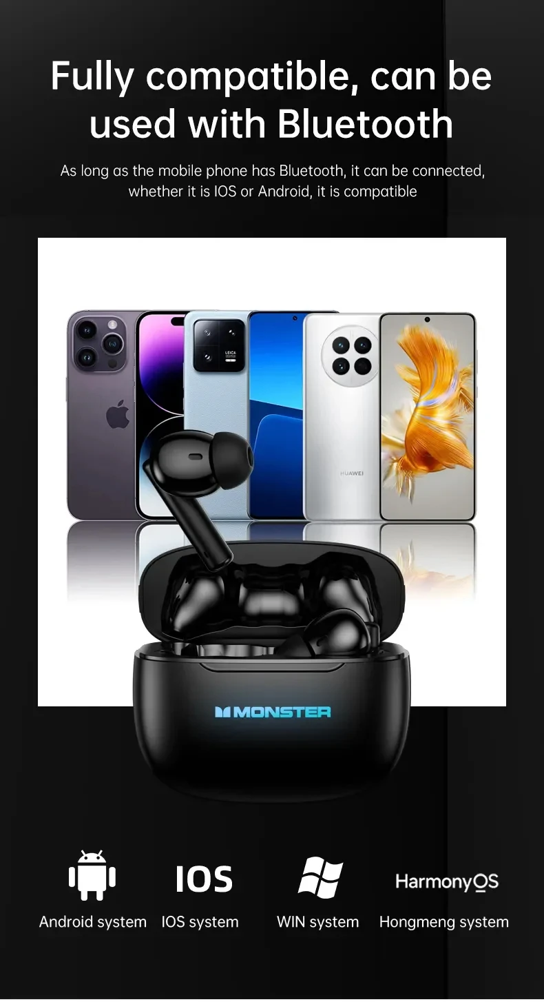 1. Diseño tecnológico: se iluminará el logotipo de monstruo en los auriculares.Experimente un audio estable y de baja latencia con Bluetooth 5.4, perfecto para juegos y transmisión.