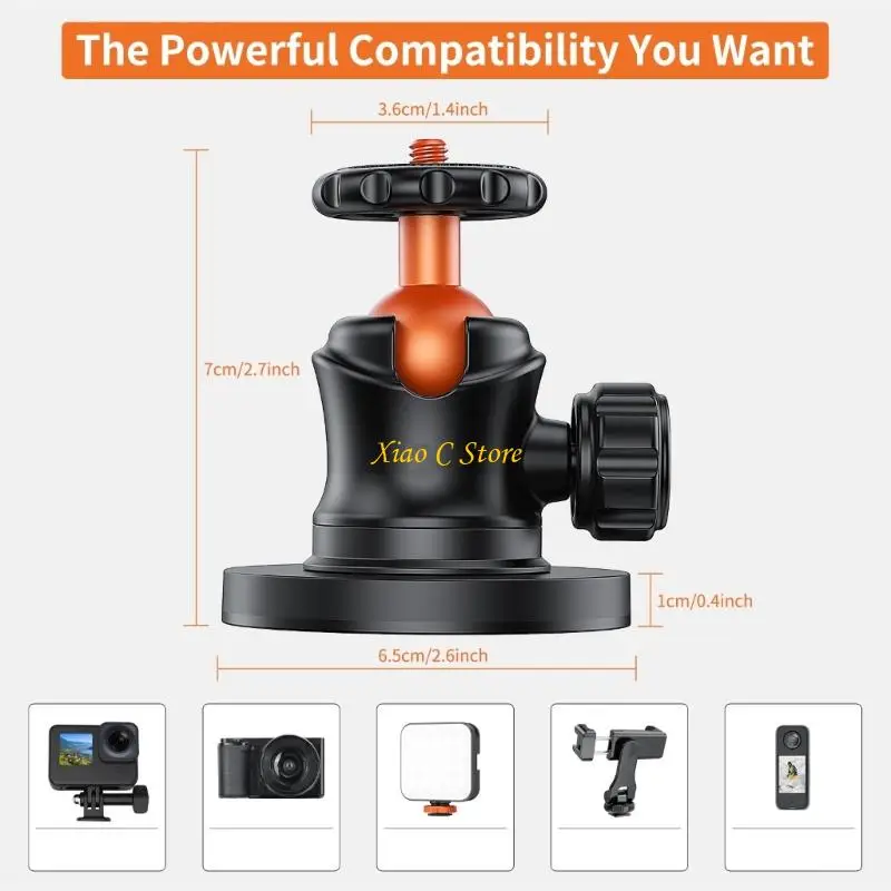 Características:OOTDTYCon una cabeza y una base esférica giratorias de 360°, este soporte para trípodes para cámara se fija de forma segura a superficies metálicas y permite múltiples ajustes en ángulo para Action y otros dispositivos compatibles con 1/4".