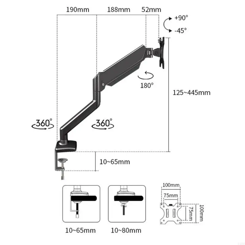 Con un diseño de ajuste de tres ejes, este brazo de monitor permite ajustes de altura, asegurando un posicionamiento que reduce la tensión en el cuello.