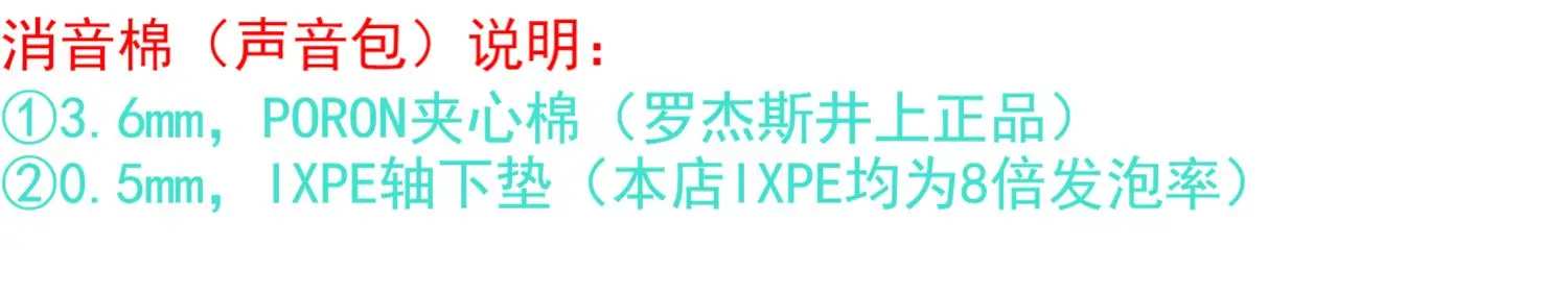 Aviso de compra:Este producto no vende teclados, teclas ni cuerpos de eje, solo accesorios de teclado como paquetes de sonido: algodón sándwich, almohadilla de eje, algodón inferior, placa de posicionamiento, etc.Las imágenes son solo de referencia, consulte el producto real para obtener más detalles.Instrucciones de algodón silenciador (paquete de sonido):1 3,5 mm, algodón sándwich Poron (Rogers Inoue genuino)2 Almohadilla de eje Ixpe de 0,5 mm (todas las Ixpe en nuestra tienda tienen una tasa de espuma de 8 veces)Este modelo utiliza una almohadilla debajo del eje para activar el modo de velocidad de la luz, lo que aumenta el retraso.Es normal no encender el modo de velocidad de la luz.Determine si debe utilizarlo según sus preferencias personales (Disparador/Sonido).3 El algodón de fondo Poron de doble capa (Roger Inoue genuino) no estará demasiado lleno para afectar la elasticidad suave, ni demasiado delgado para causar un ruido excesivo de la cavidad. Adaptarse a la carcasa incorporada. Si es necesario reemplazar la carcasa, envíe un enlace o comuníquese con el servicio de atención al cliente con imágenes para ver si es compatible.