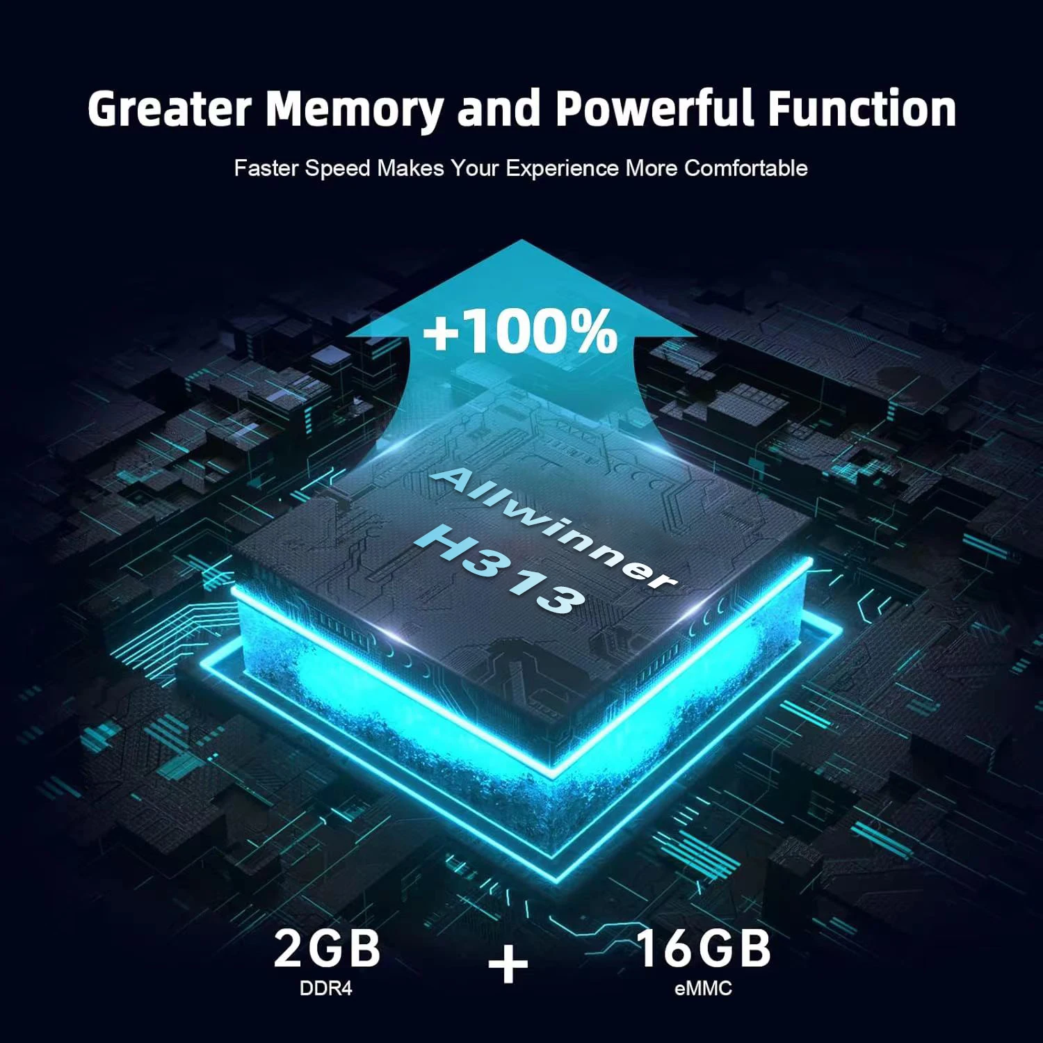 Rendimiento potente, funcionamiento fluido: equipado con procesador Cortex-A53 de cuatro núcleos H313, hasta 1,5 GHz, GPU MP2 Mali-G31 incorporado, admite aceleración de gráficos 3D de hardware, satisface fácilmente las necesidades de reproducción de video de alta definición, juegos, etc.
