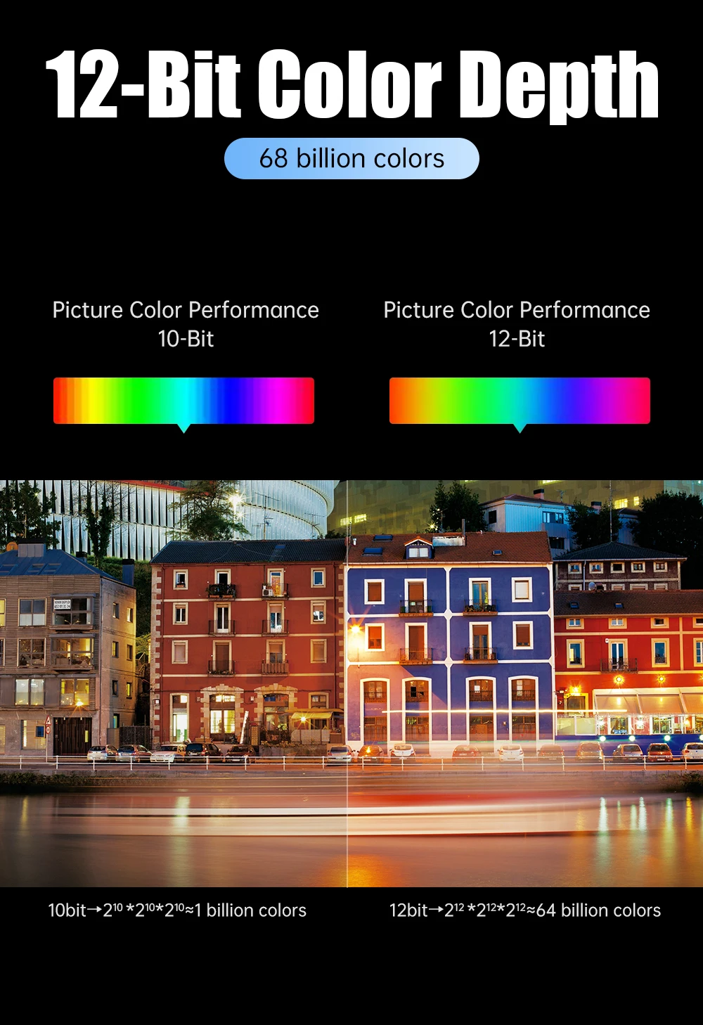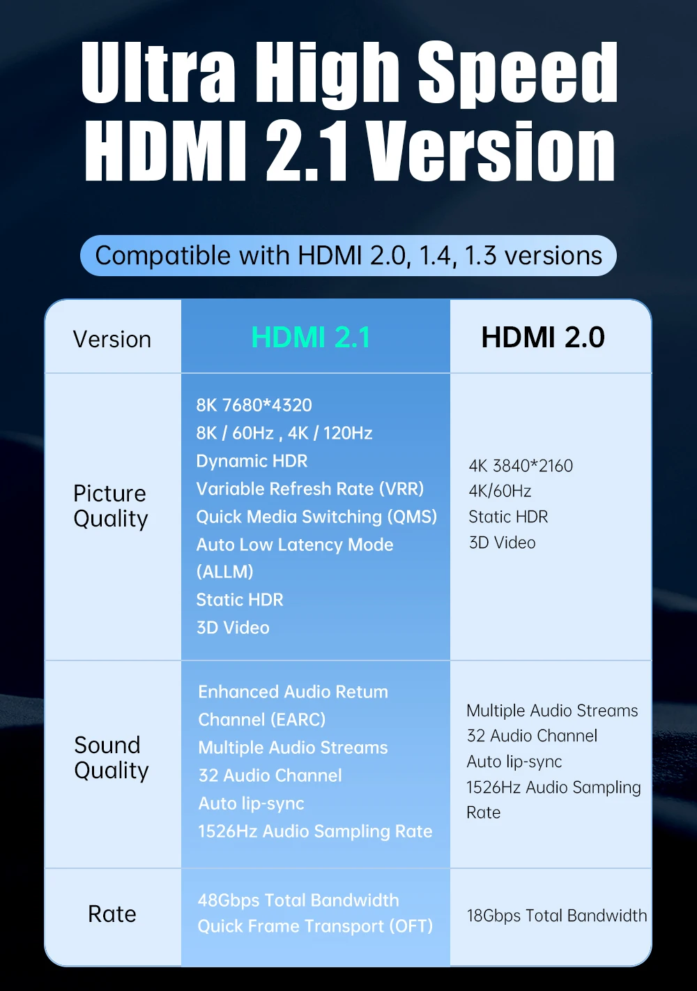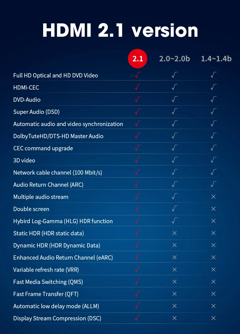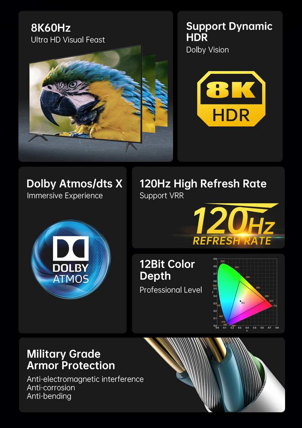 Admite pantalla de vídeo 3D, HDR dinámico, HDR10 +, VESA DSC 1.2a, BT.2020 y Dolby Vision, mejora los valores de cada momento para profundidad, detalle, brillo, frecuencia de actualización variable (VRR) y transporte rápido de fotogramas, canal de retorno de audio mejorado (eARC).
