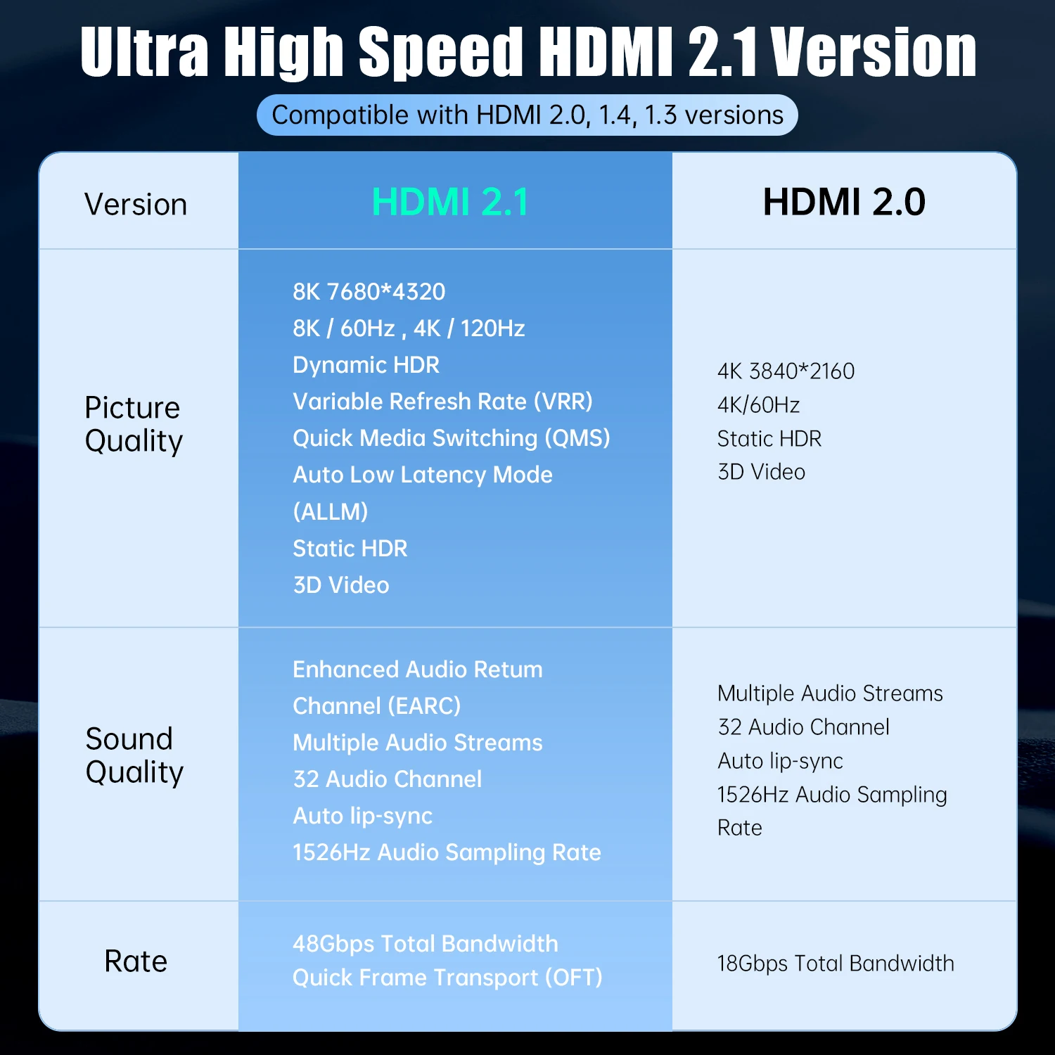 MOSHOU 8K HDMI 2,1 cable compatible con 8K @ 60Hz, 4K @ 120Hz/60Hz, 2K 144Hz, adecuado para todos los dispositivos con HDMI 2,1 estándar, retrocompatible con HDMI 2,0, 1,4, 1,3, 1,2 y 1,1 anteriores. Con un ancho de banda de 48Gbps para las últimas funciones, disfrute de la experiencia definitiva de ultra alta definición de la pantalla grande.