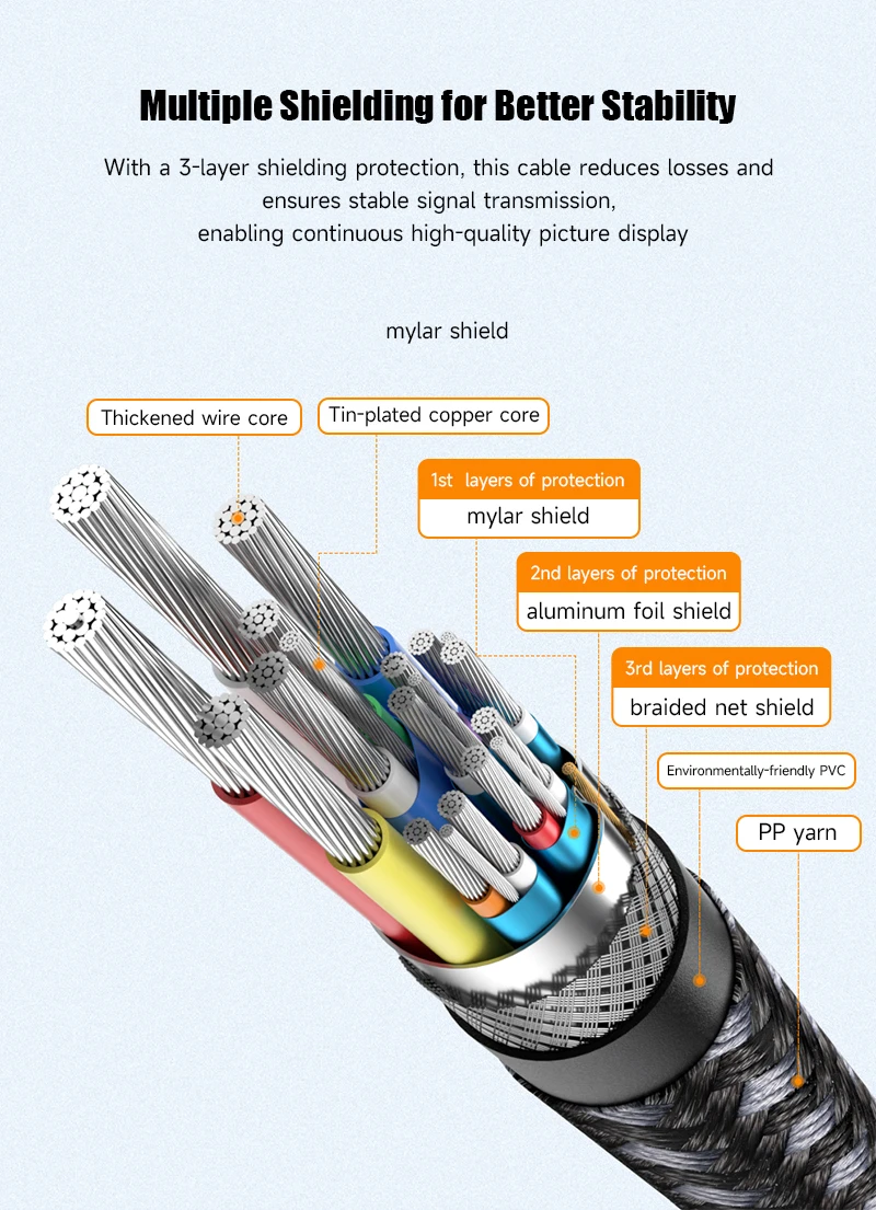 El cable HDMI está diseñado con una carcasa monocasco de aleación de aluminio delgada y ligera que es resistente a la corrosión, lo que permite una disipación óptima del calor. Los conectores chapados en oro de 24K y el blindaje de cobre multicapa minimizan la pérdida de señal, lo que resulta en una claridad increíble y un sonido suave. Además, la funda de nailon trenzado flexible proporciona una mayor durabilidad y alivio de tensión, reduciendo el riesgo de deshilacharse o retorcerse