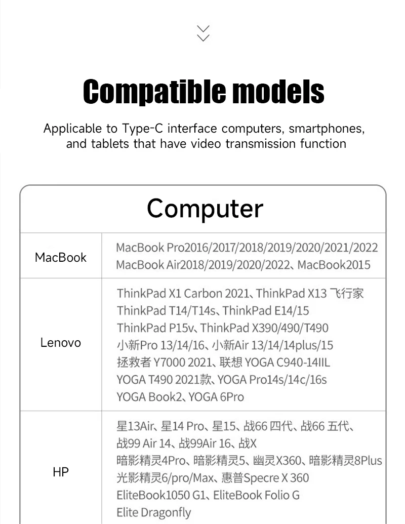 Este cable HDMI es compatible con todos los dispositivos que admiten puertos "DP Alt Mode" y Thunderbolt 3/4. También es compatible con varios dispositivos Apple como MacBook Pro 2016-2021, MacBook Air 2018-2022, iMac 2017/2020, iMac Pro 2021, Mac Mini 2016-2021 y iPad Pro 2018/2020, así como otros dispositivos como Surface Book 3, Surface Pro 7, Surface Laptop 3, Chromebook, Dell XPS 13/15, Galaxy S22/S21, Note 20/10, LG V40 y más