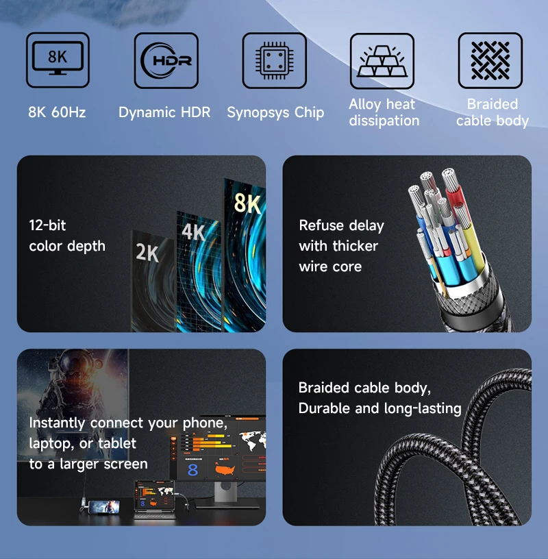 El cable es capaz de transmitir computadoras portátiles, tabletas, consolas de escritorio y teléfonos inteligentes con puertos directamente a monitores, televisores y proyectores equipados con puertos HDMI. Este cable admite resoluciones de pantalla de hasta 8K @ 60Hz, lo que significa que puede mostrar imágenes o información con un ancho de aproximadamente 8.000 píxeles. HDMI es una conexión de cable utilizada para enviar información visual y de audio a las pantallas. Además, este cable puede ofrecer una resolución de hasta 4K @ 120Hz y es compatible con versiones anteriores de 4K @ 144Hz, 2K @ 240Hz y 2K @ 165Hz