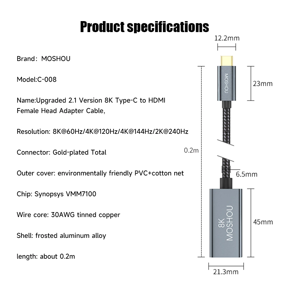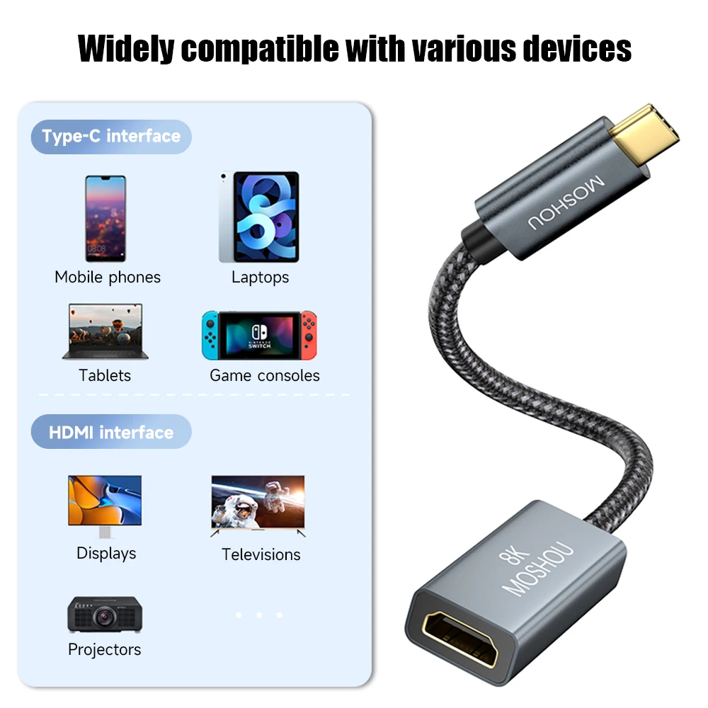 Comprar MOSHOU-adaptador Thunderbolt 3 USB tipo C a HDMI 2,1, convertidor de vídeo macho a hembra, 8K @ 60Hz, 4K @ 120Hz, extensor de 48Gbps