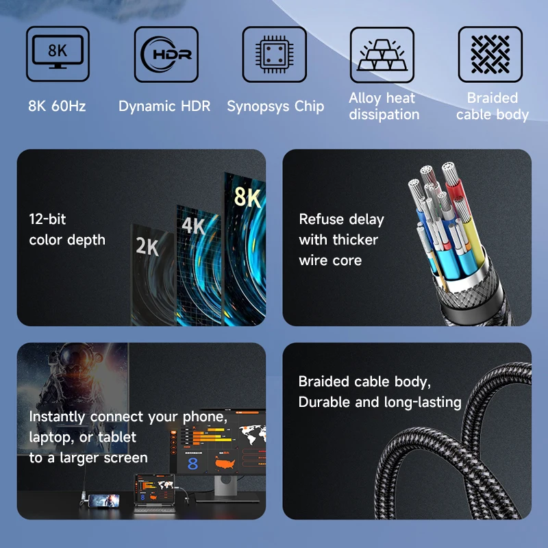 El cable es capaz de transmitir computadoras portátiles, tabletas, consolas de escritorio y teléfonos inteligentes con puertos directamente a monitores, televisores y proyectores equipados con puertos HDMI. Este cable admite resoluciones de pantalla de hasta 8K @ 60Hz, lo que significa que puede mostrar imágenes o información con un ancho de aproximadamente 8.000 píxeles. HDMI es una conexión de cable utilizada para enviar información visual y de audio a las pantallas. Además, este cable puede ofrecer una resolución de hasta 4K @ 120Hz y es compatible con versiones anteriores de 4K @ 144Hz, 2K @ 240Hz y 2K @ 165Hz