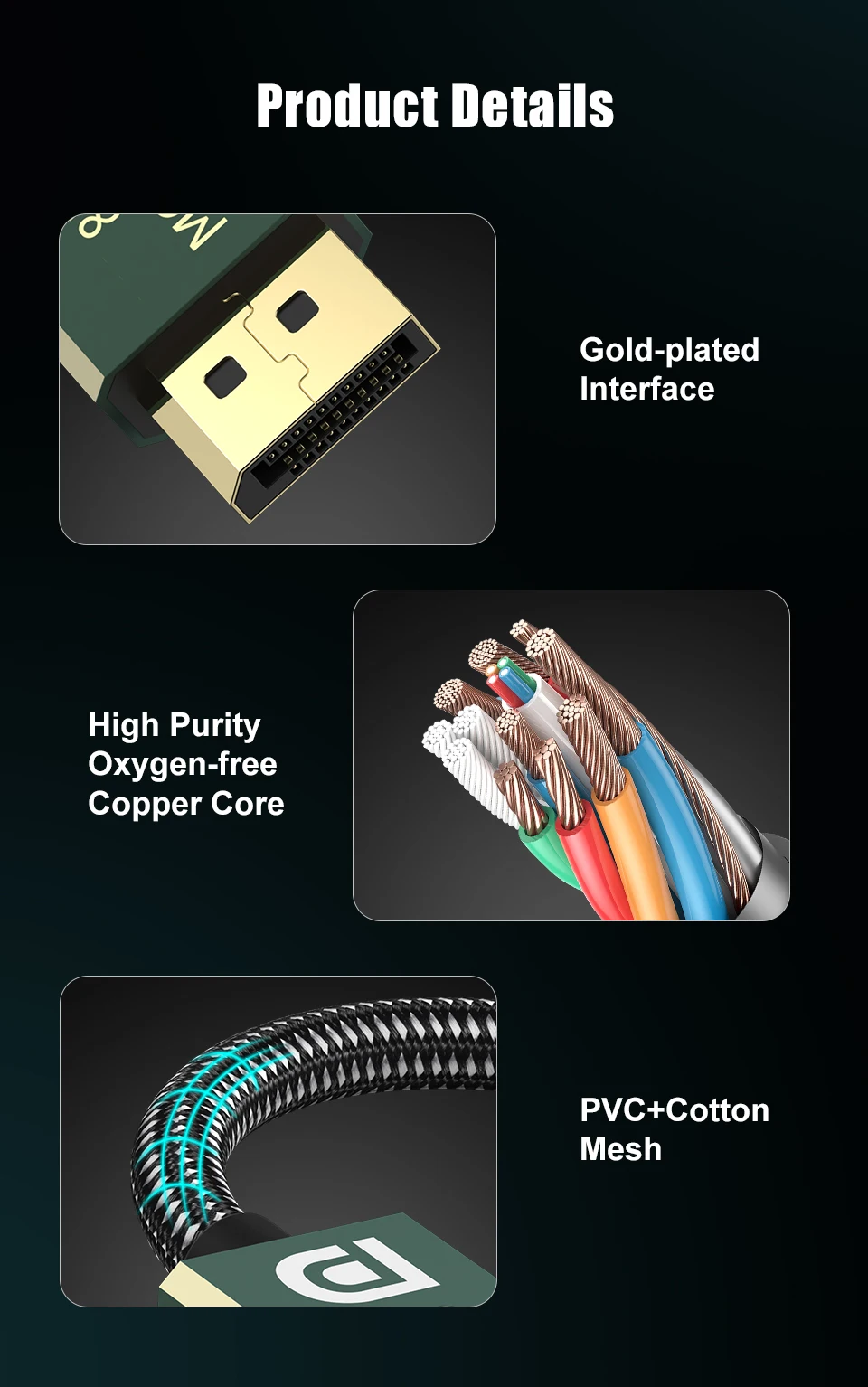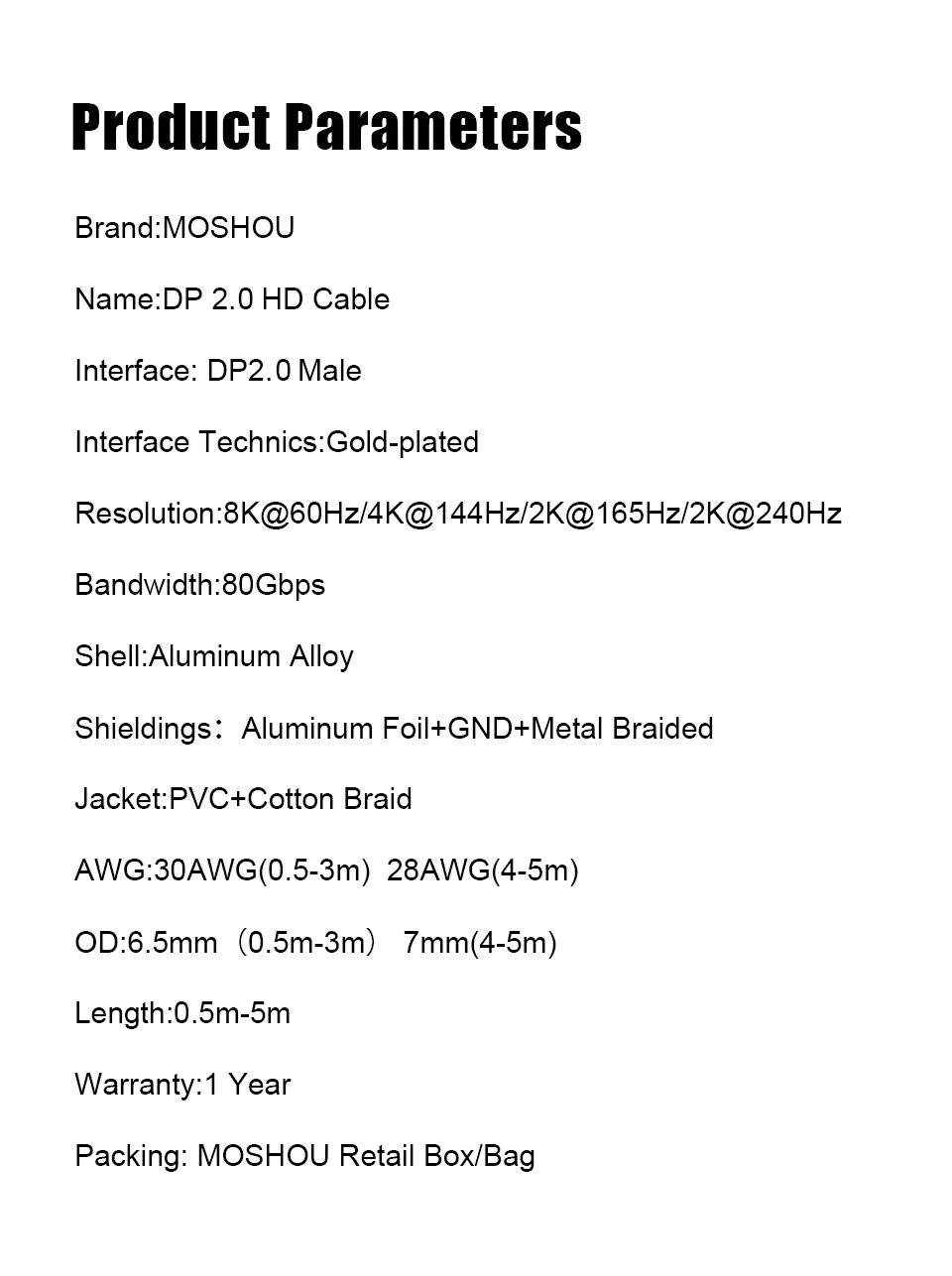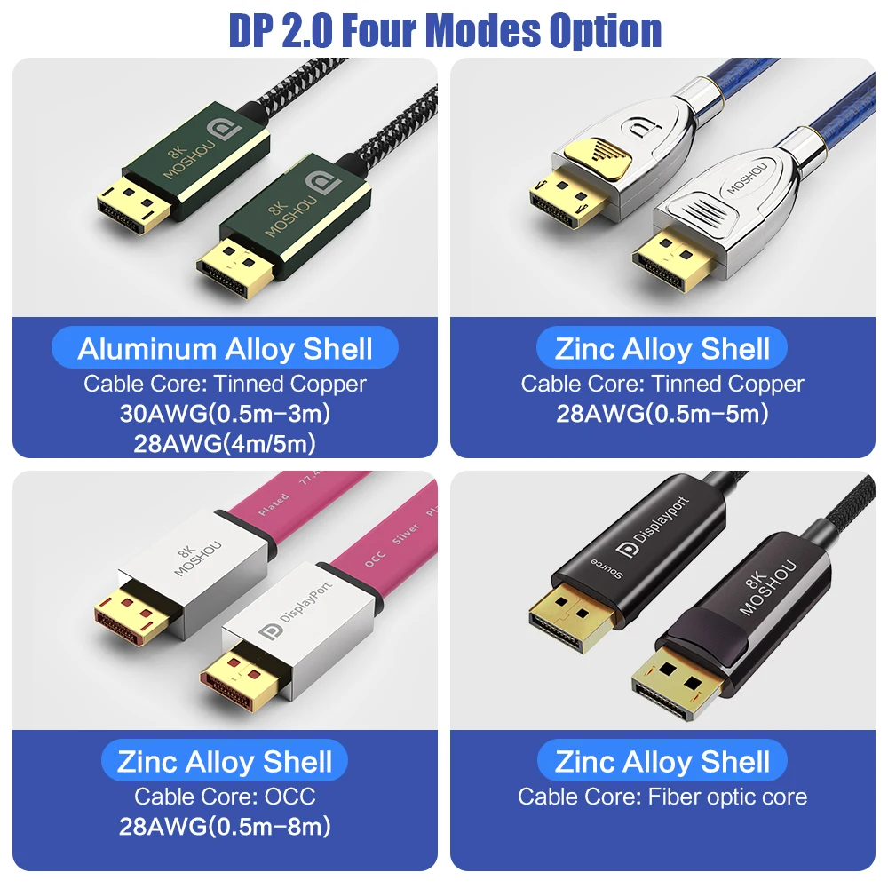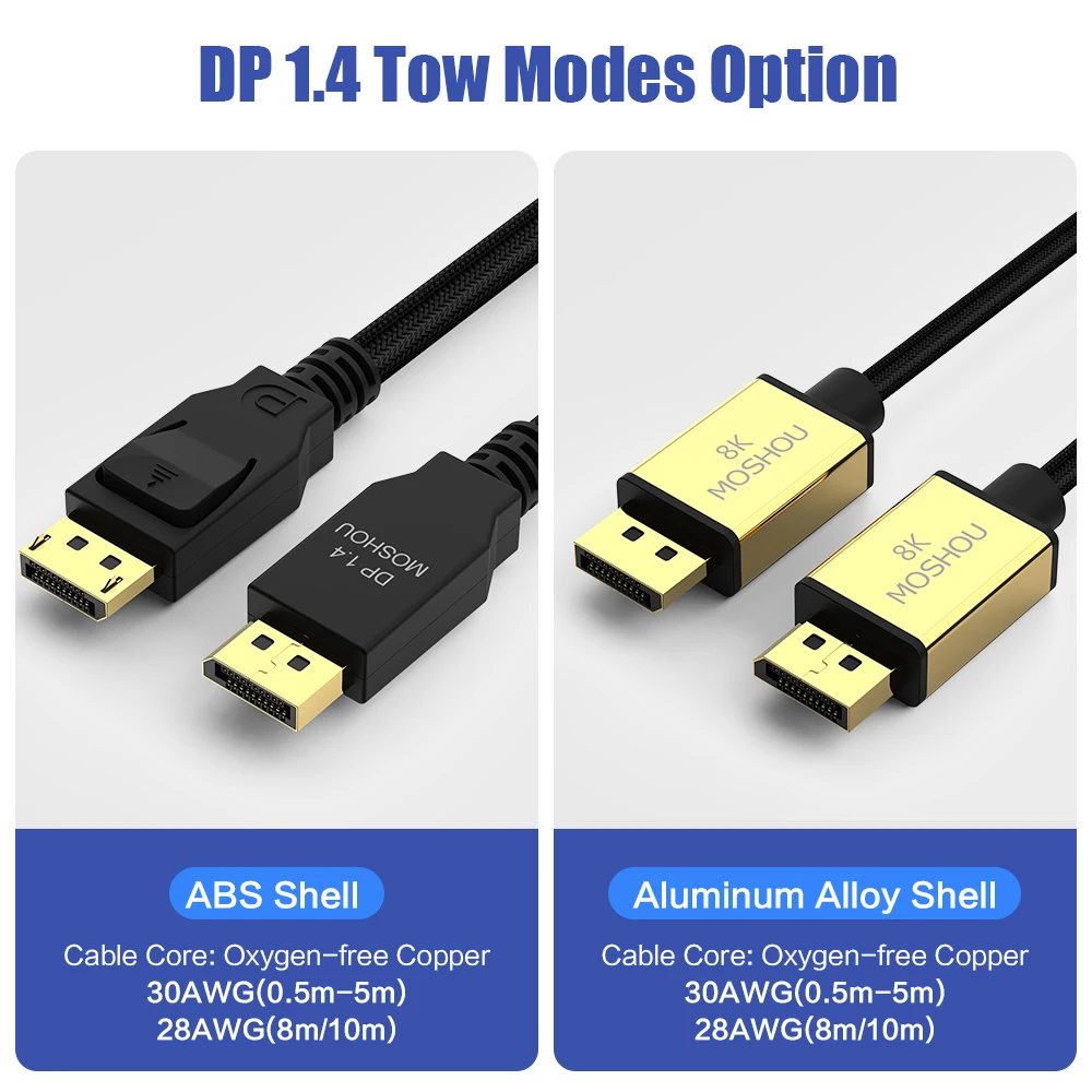 El cable MOSHOU DP 2,0 tiene un triple blindaje y hojalata, es altamente resistente con EMI. El conductor está hecho de núcleo de cobre de 28AWG. Tiene una fuerte chaqueta trenzada de nailon, que es 10 veces más duradera que el PVC. Tolerancia de una vida útil de curvatura superior a 30.000. Puede proporcionar una mayor conectividad para la transmisión de señal.