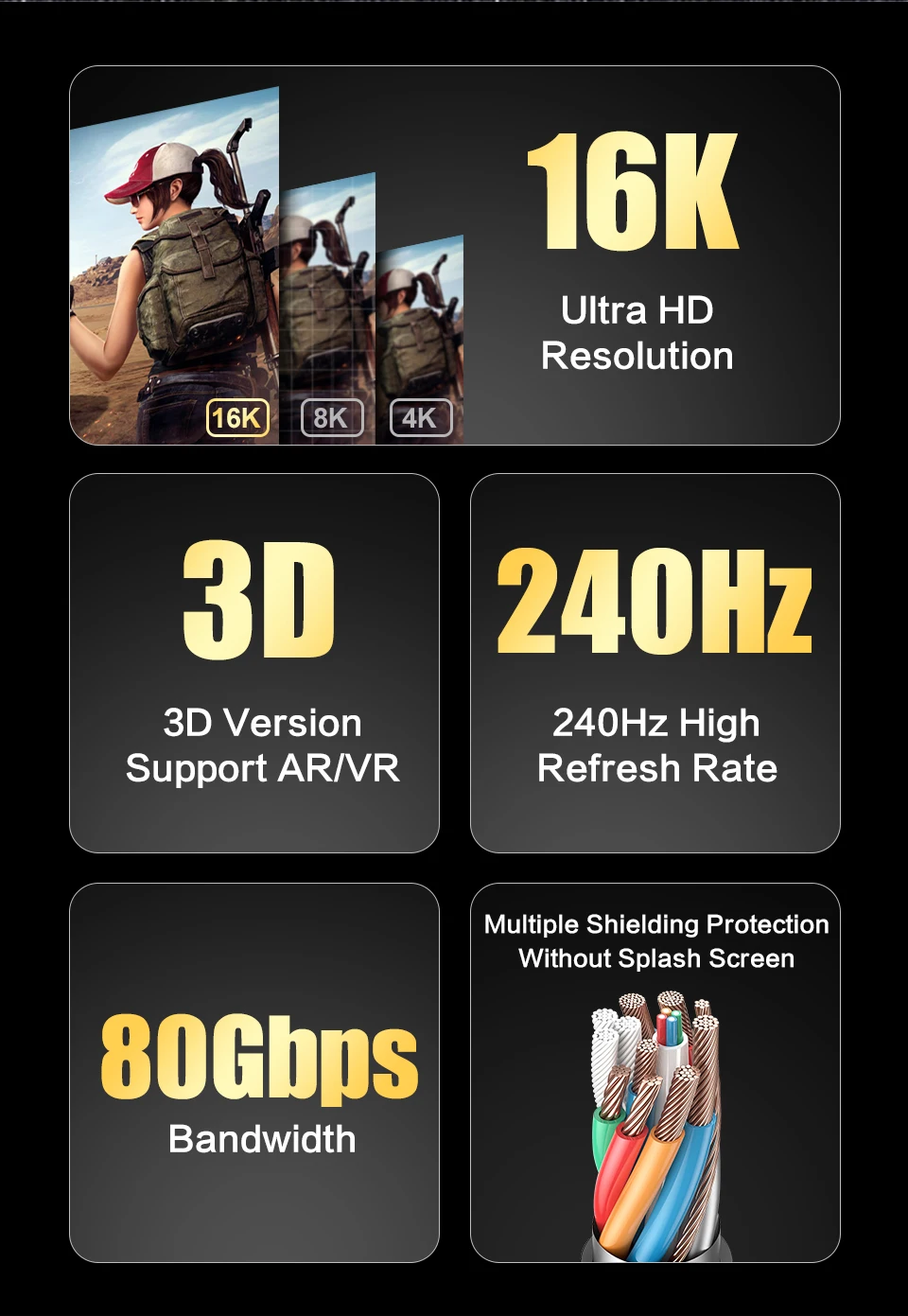 El cable DisplayPort 2,0 de gama alta es compatible con las tecnologías FreeSync y G Sync para disfrutar de un juego fluido y sin desgarros, lo que le permite percibir claramente el movimiento del enemigo. HDR dinámico puede optimizar la imagen oscura del juego y mejorar los detalles, especialmente en FPS, obras maestras 3A y juegos MOBA.