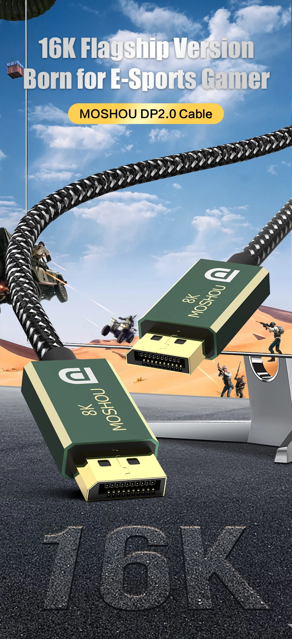 Comprar MOSHOU-Cable DisplayPort 2,0 DP 2,0, 16K @ 30Hz, 8K @ 60Hz, 80Gbps, HDR, puerto de visualización de vídeo, 2,0, FreeSync, g-sync, Monitor de juegos