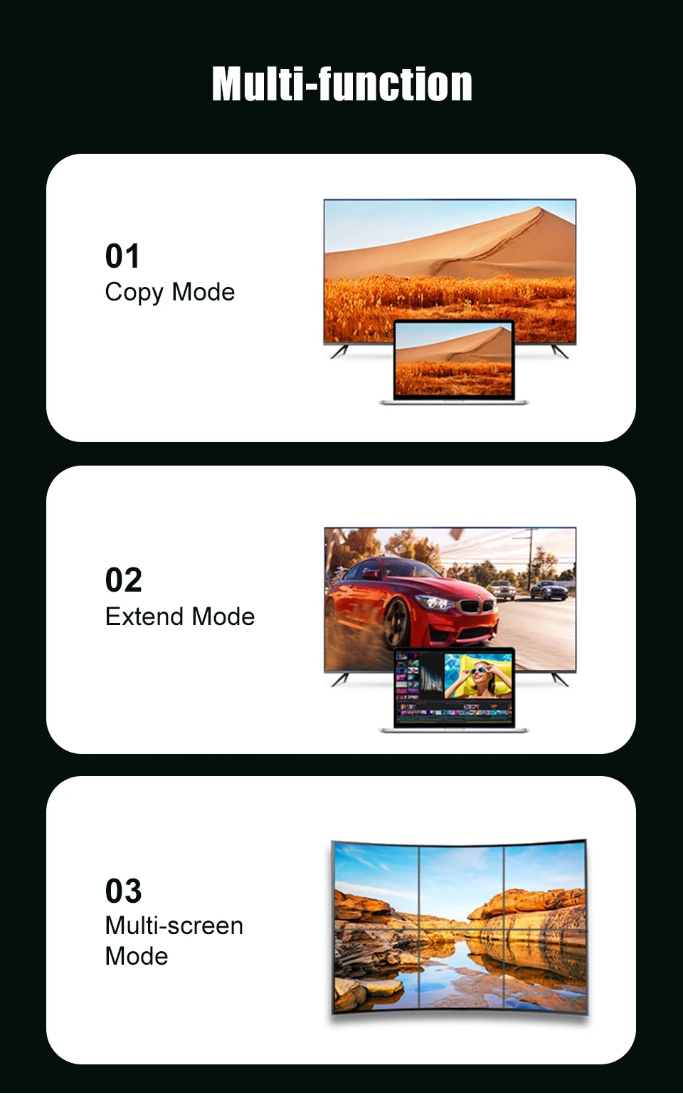 El cable DisplayPort 2,0 admite 16K @ 30Hz con DSC, 10K @ 60Hz, 8K @ 120Hz/60Hz, 4K @ 240Hz/165Hz/144Hz. Salida de video de pantalla única de 16K @ 30Hz (DSC), 10K @ 60Hz y pantalla dual 8K @ 120Hz, 4K @ 144Hz, pantalla de tres pantallas para 4K @ 60Hz