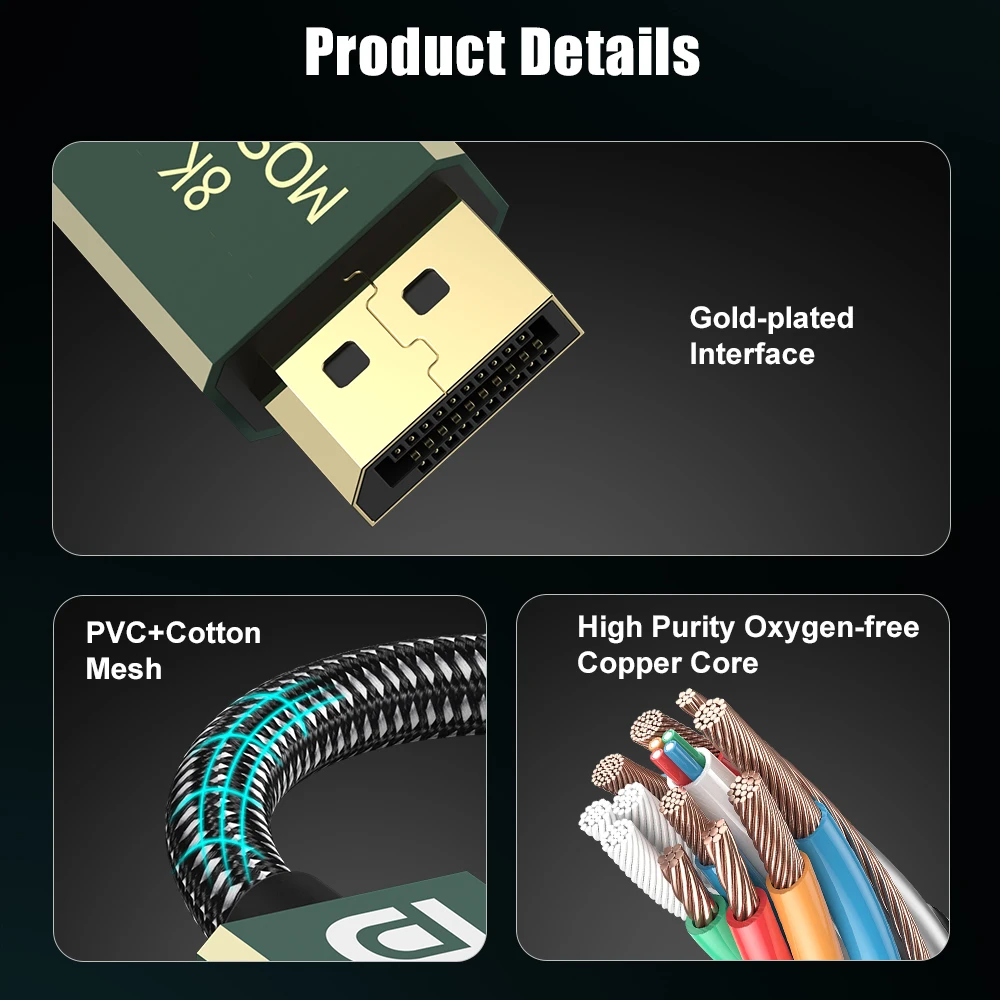 El cable MOSHOU DP 2,0 tiene un triple blindaje y hojalata, es altamente resistente con EMI. El conductor está hecho de núcleo de cobre de 28AWG. Tiene una fuerte chaqueta trenzada de nailon, que es 10 veces más duradera que el PVC. Tolerancia de una vida útil de curvatura superior a 30.000. Puede proporcionar una mayor conectividad para la transmisión de señal.