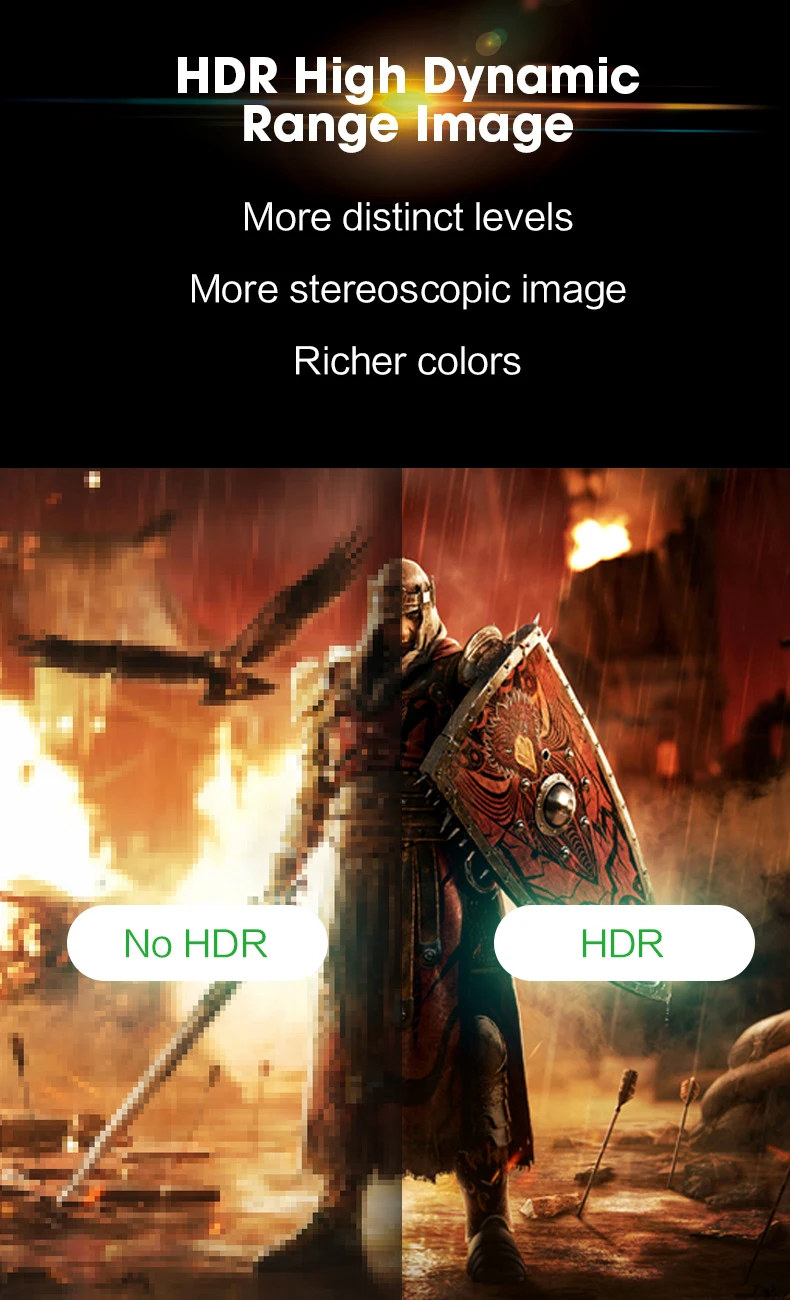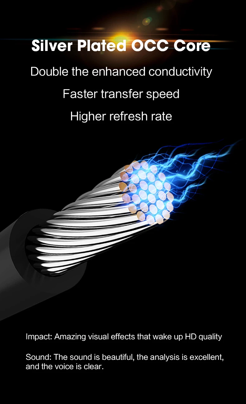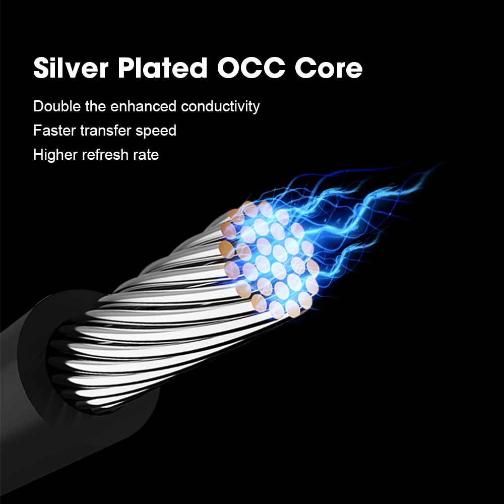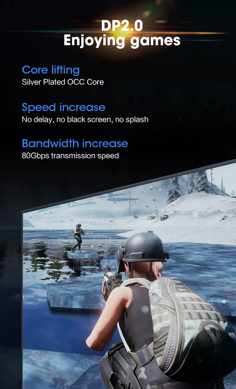 El cable DisplayPort 2,0 de gama alta es compatible con las tecnologías FreeSync y G Sync para disfrutar de un juego fluido y sin desgarros, lo que le permite percibir claramente el movimiento del enemigo. HDR dinámico puede optimizar la imagen oscura del juego y mejorar los detalles, especialmente en FPS, obras maestras 3A y juegos MOBA.