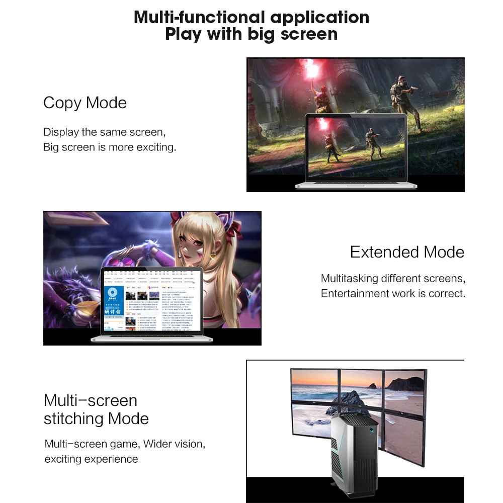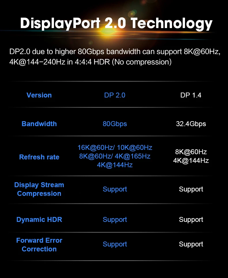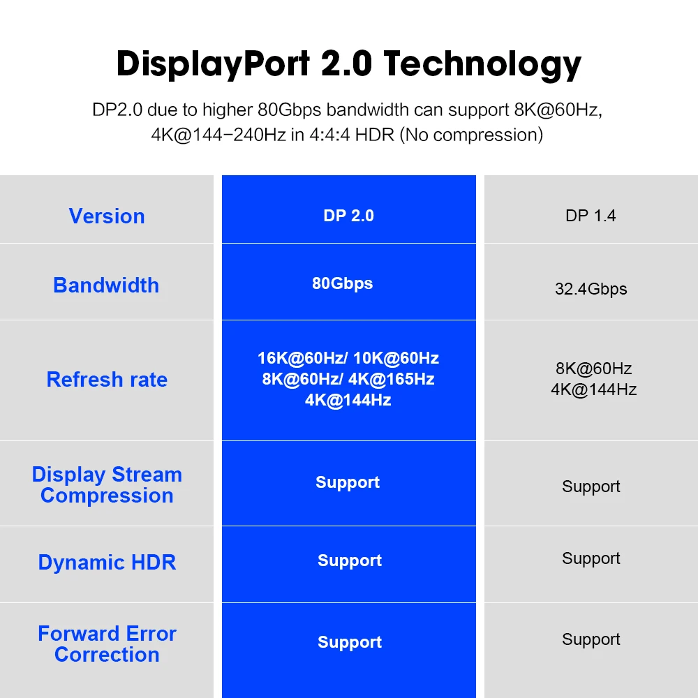 Cable DisplayPort 2,0 compatible con 16K @ 60Hz con DSC, 10K @ 60Hz, 8K @ 120Hz/60Hz, 4K @ 240Hz/165Hz/144Hz. Salida de vídeo de una sola pantalla de 16K a 60Hz (DSC), doble pantalla 8K a 120Hz, 4K a 144Hz, pantalla de tres pantallas para 4K a 60Hz
