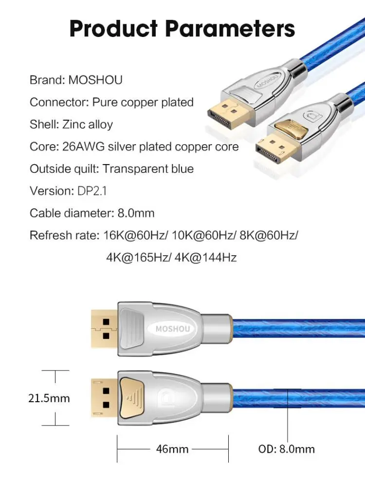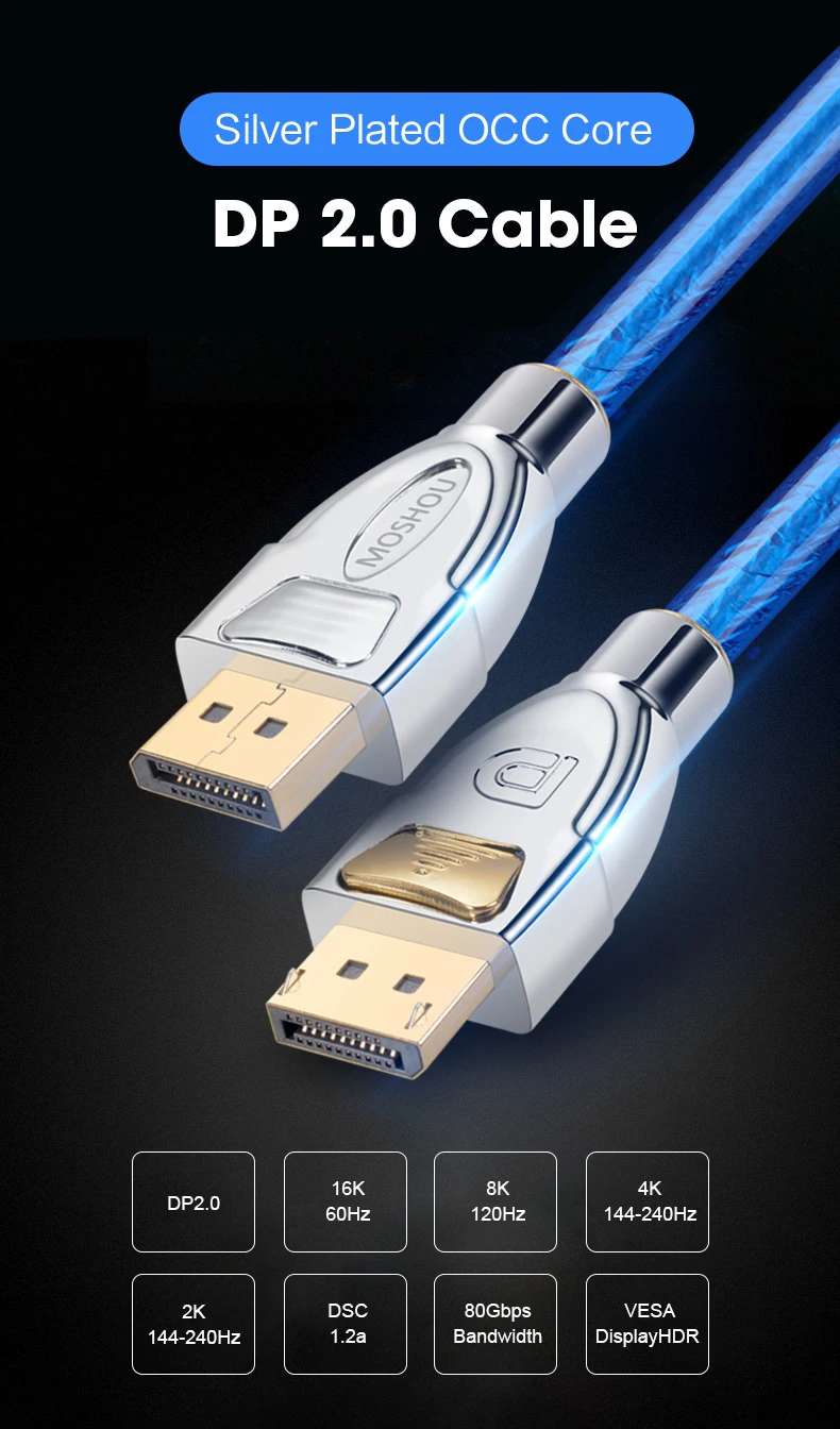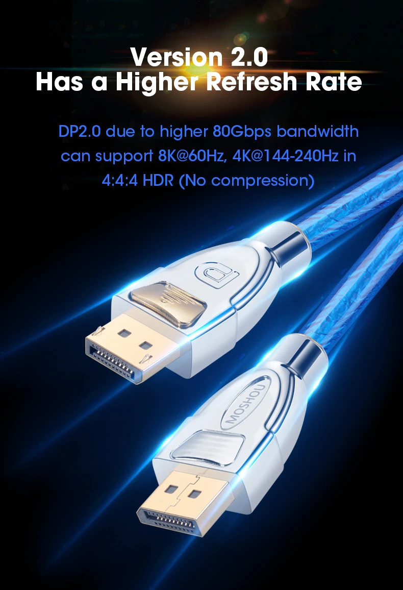 Comprar MOSHOU-Cable DisplayPort 2,0 DP 2,0, 16K @ 60Hz, 4K @ 144Hz, alta velocidad, ancho de banda de 80Gbps, compatible con HDR, HDCP 2,2, arco 3D para Monitor de juegos