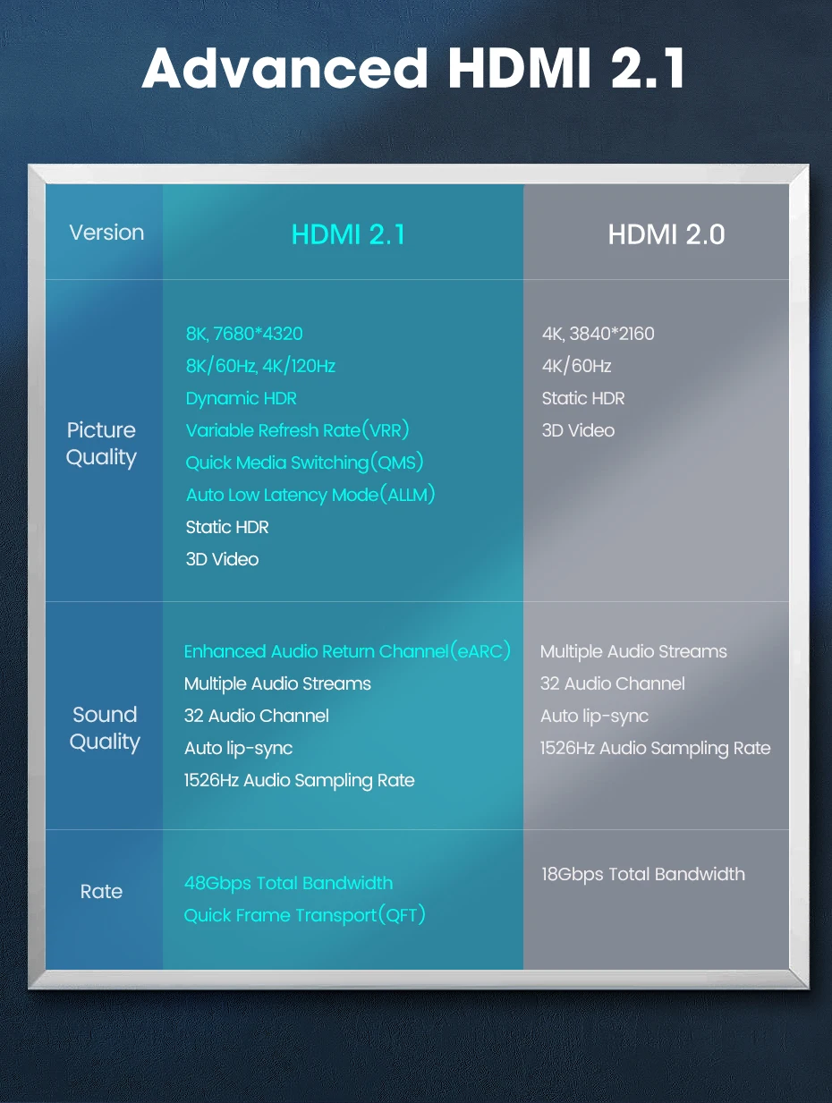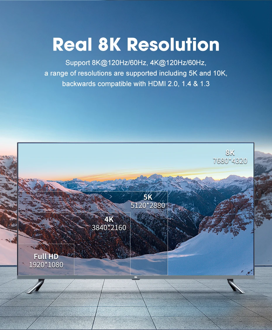 【 8K @ 60Hz 】Nuestro 8K HDMI 2,1Soporte cable 8K @ 60Hz, 4K @ 120Hz/60Hz, 2K 144Hz, Se admite un rango de resoluciones que incluye 5K y 10K, hacia atrás Compatible con HDMI 2,0, 1,4 y 1,3