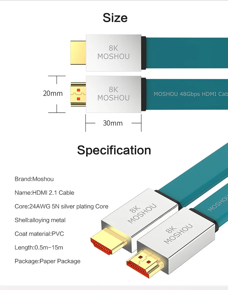 MOSHOU 8K HDMI 2,1 cable compatible con 8K @ 60Hz, 4K @ 120Hz/60Hz, 2K 144Hz, adecuado para todos los dispositivos con HDMI 2,1 estándar, retrocompatible con HDMI 2,0, 1,4, 1,3, 1,2 y 1,1 anteriores. Con un ancho de banda de 48Gbps para las últimas funciones, disfrute de la experiencia definitiva de ultra alta definición de la pantalla grande.