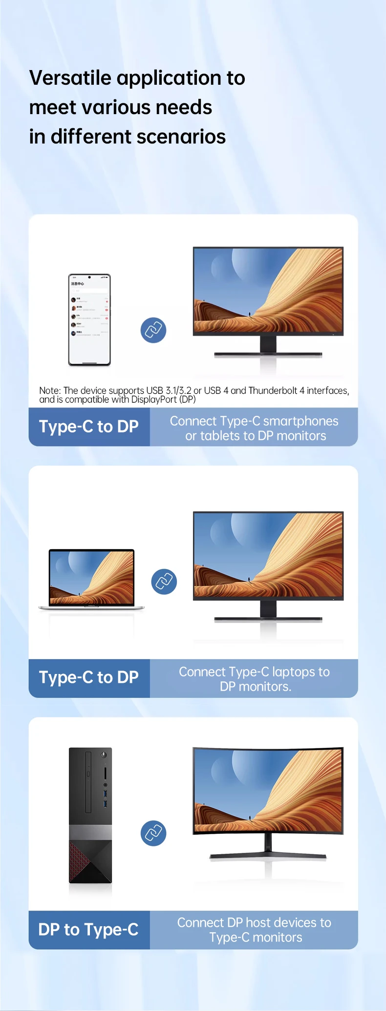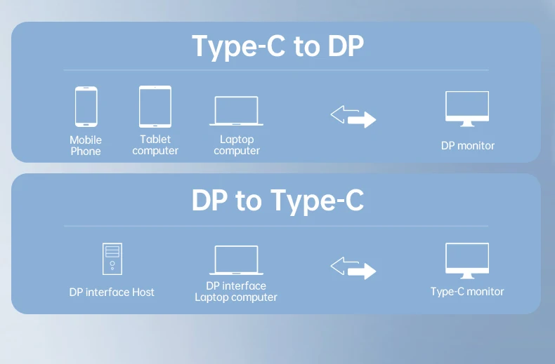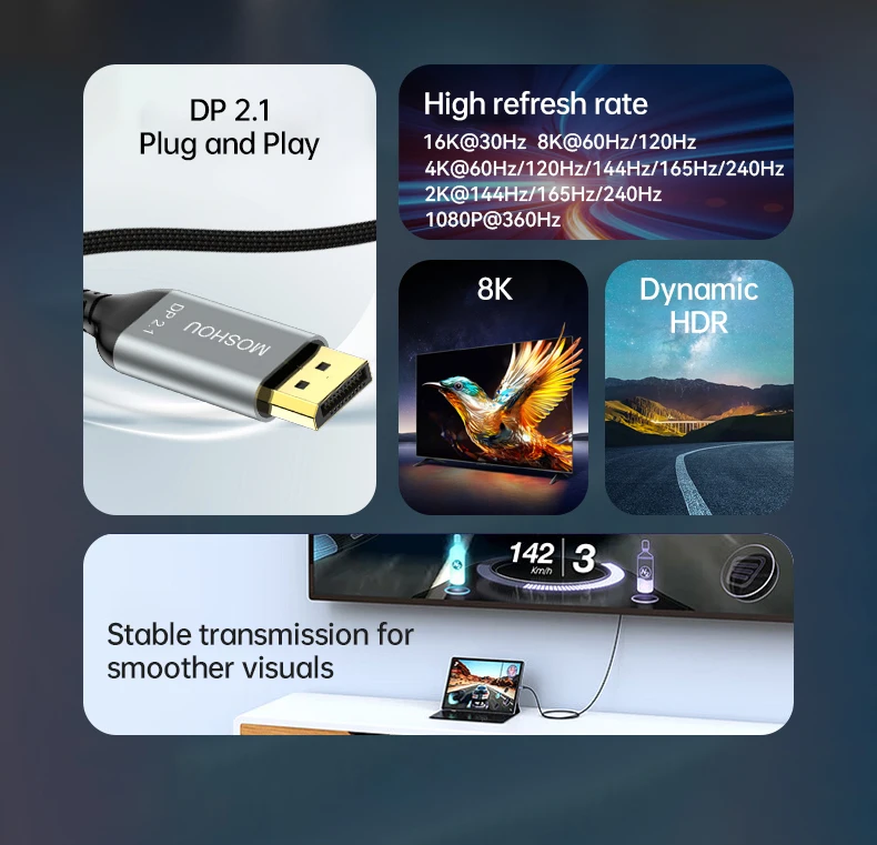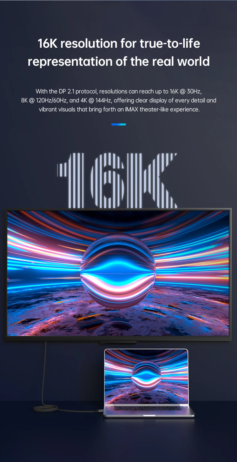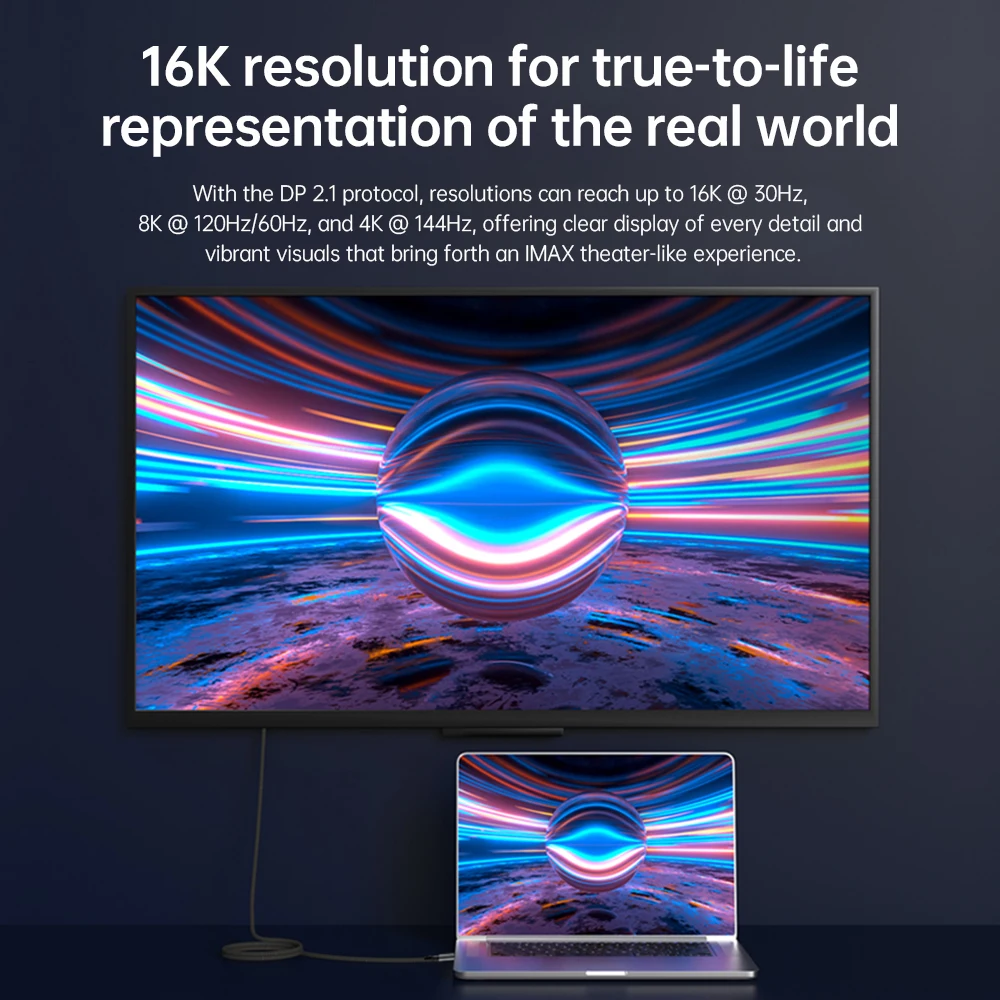 El cable USB C a DisplayPort 2,1 admite MAX 16K @ 30Hz, 8K @ 60Hz, 5K(5120x2880)@ 60Hz, 4K(5120x1440)@ 120Hz, 4K @ 144Hz, 2K @ 240Hz/165Hz y puede conducir hasta 4 monitores 1080P. Evite el parpadeo de la pantalla y el recorte de audio y transmita eventos deportivos, películas, fotos y álbumes sin problemas.