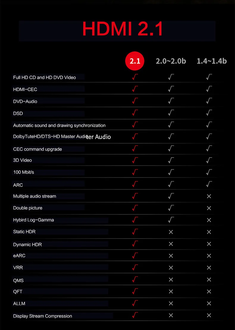 Compatible con HDR10 +, VESA DSC 1.2a, BT.2020 y Dolby Vision, mejora los valores de cada momento para profundidad, detalle, brillo, frecuencia de actualización Variable (VRR) y transporte rápido de fotogramas, canal de retorno de Audio mejorado (auricular).