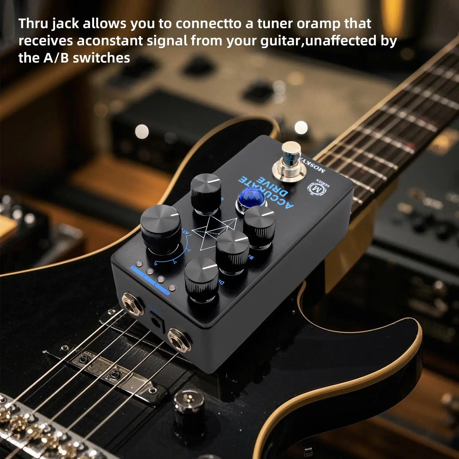 Funcionalidad Thru Jack: El Thru jack de este pedal le permite conectarse a un sintonizador, amplificador u otros dispositivos que requieran una señal constante de su guitarra, lo que garantiza que su rendimiento permanezca ininterrumpido mediante el cambio A/B.