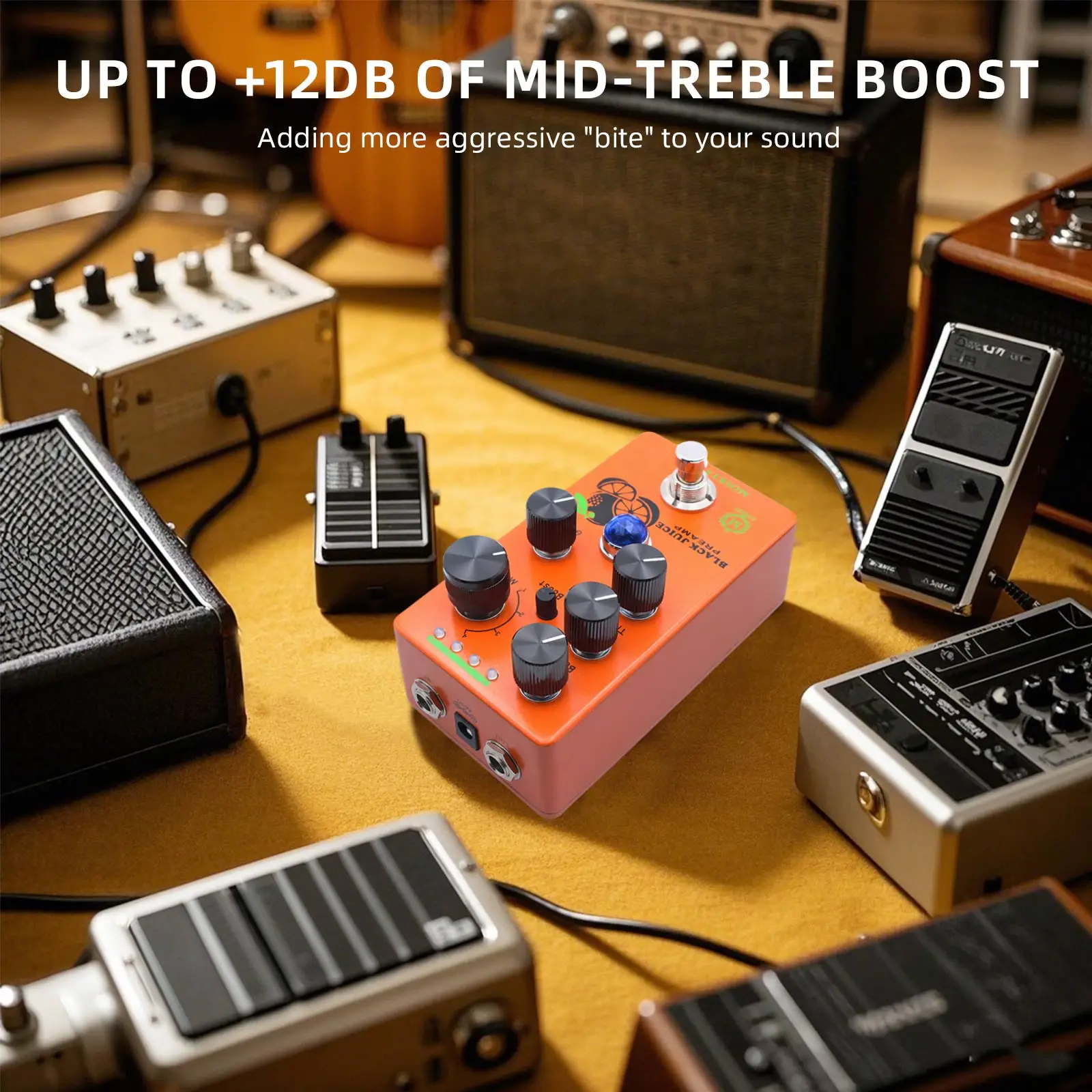 Perilla Mid Boost: Con la perilla Mid Boost, este pedal de guitarra proporciona un punzón bien definido que ayuda a que su tono se destaque en cualquier combinación, lo que lo hace ideal tanto para presentaciones en vivo como para grabaciones de estudio.