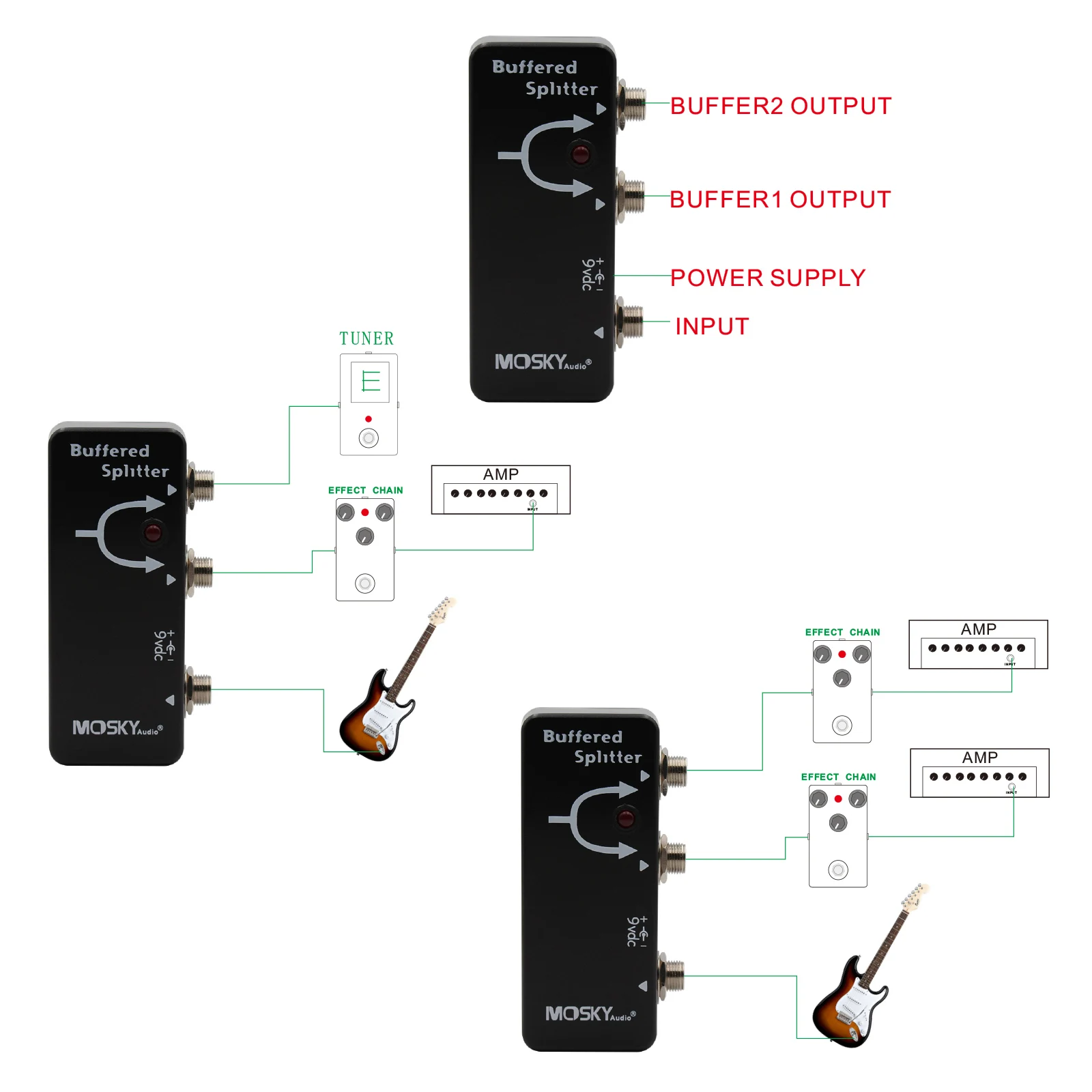 Aumento de adrenalina para su sonido: el pedal de efecto de guitarra Mosky BUFFERED SPLITTER está diseñado para darle a cada salida un impulso potente, asegurando que la señal de su guitarra alcance su amplificador con la máxima fuerza y claridad.El Buffered Splitter es como darle a cada salida un golpe de adrenalina, asegurando que golpeen su amplificador con la misma fuerza y carácter que dejó sus dedos.