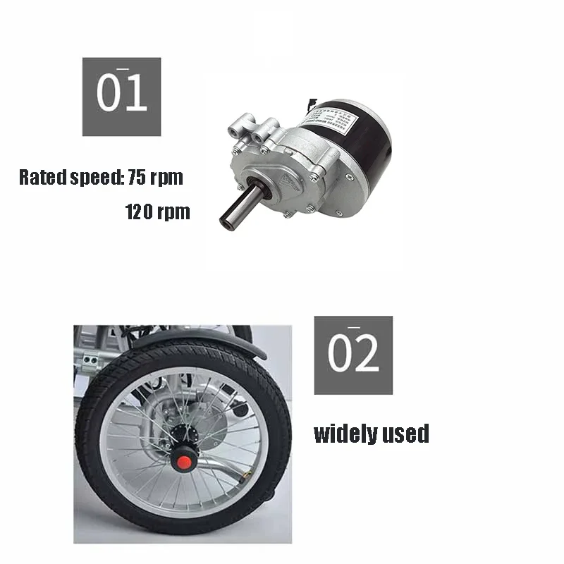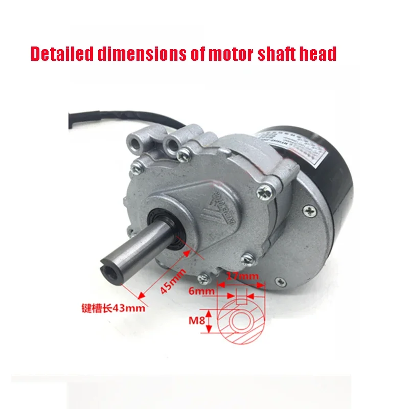 250w 24v 75rpm or 120rpm low speed brush motor, 44mm Longer shaft, Shaft Diameter 17mm , wheel chair used DC gear brushed motor Model: wheelchair motors Working voltage: 24 v The wheelchair motor output power: 250 w Speed: racing 75 RPM The installation structure: end face Function types: wheelchairs Form: IP44 Insulation class: E Power categories: dc Working principle: permanent magnet dc Product introduction: it has small volume, low speed high torque output, low noise, high reliability, easy maintenance, etc. The output speed have 75rpm and 120rpm two types. 250W 24V brush motor Shaft Diameter: 17mm Actual speed: 120 RPM 75RPM
