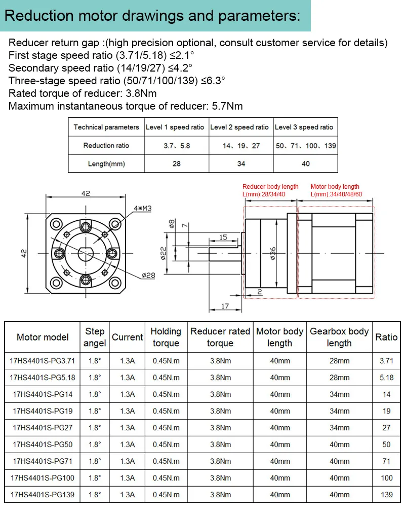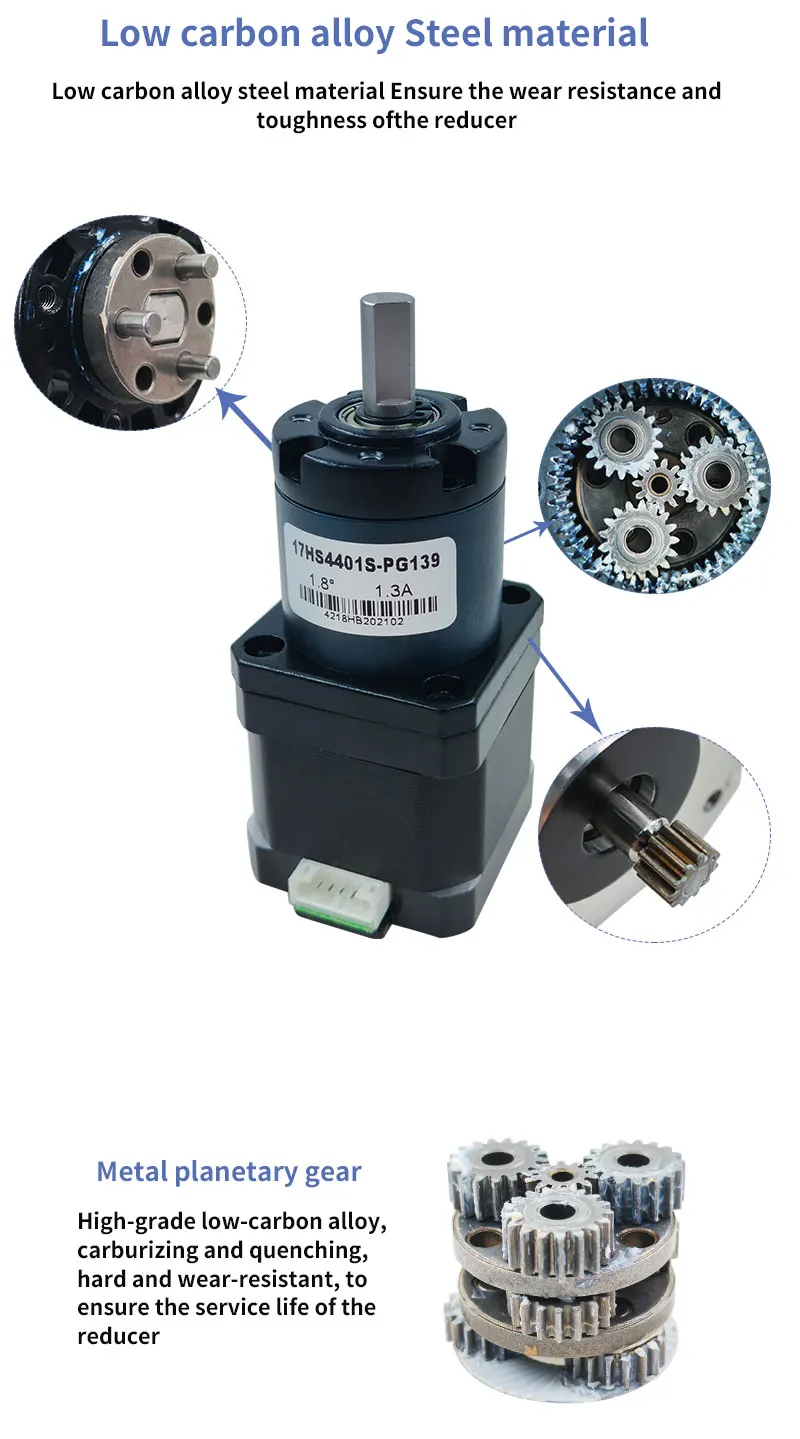 Motor paso a paso 42BYG, 40mm de longitud corporal con relación 3,71: 1 -139:1, NEMA17, engranaje planetario, motor paso a paso con caja de cambios, 1 unidad