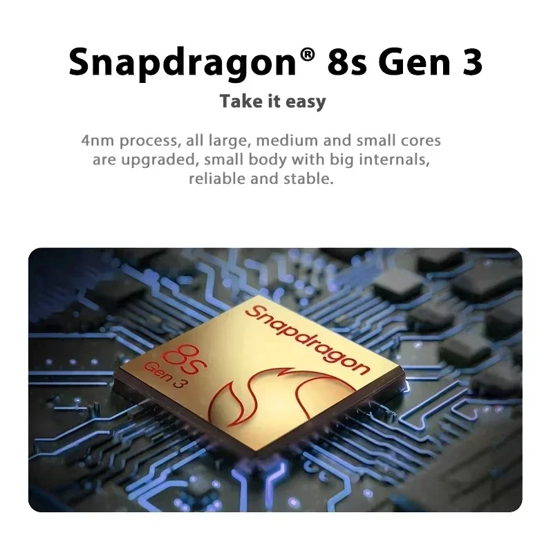 Rendimiento Snapdragon 8s 3.a generación.Maximice sus posibilidades con el potente procesamiento de un motor de inteligencia artificial, brindándole velocidades de hasta 3 GHz y más eficiencia.