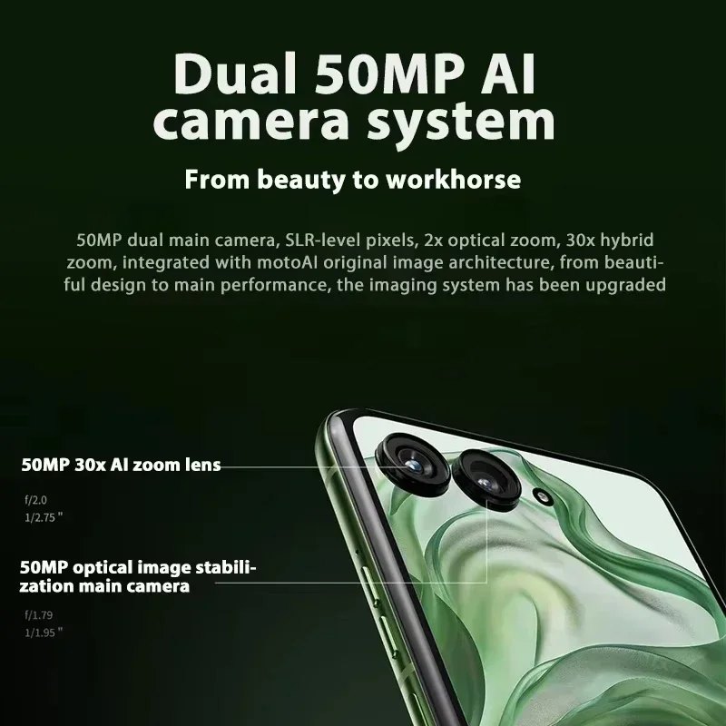 Nuevo sistema de cámara con tecnología moto ai.Capture fotografías y vídeos fácilmente con el sistema de cámara de 50MP con teleobjetivo de doble aumento y tecnología moto ai.